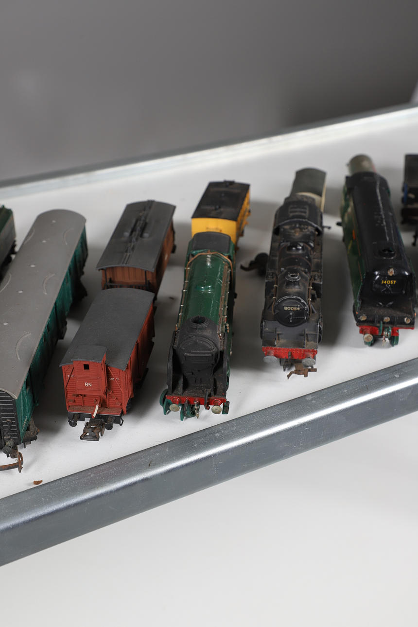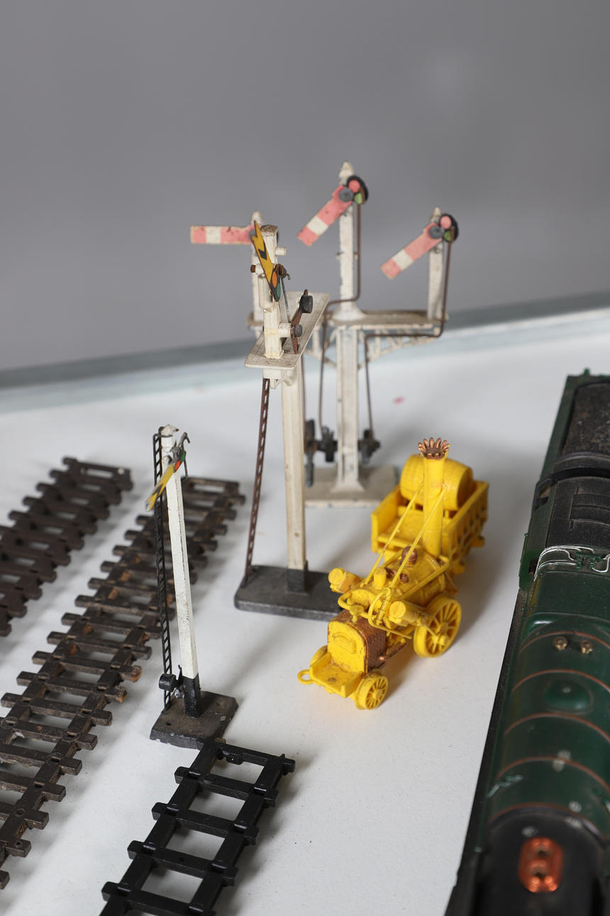 To include various locomotives (tri-ang and Airfix) and carriages. Together with other assorted railway accessories, track, signals, signs, railway station (length 39cm) etc. (Qty).