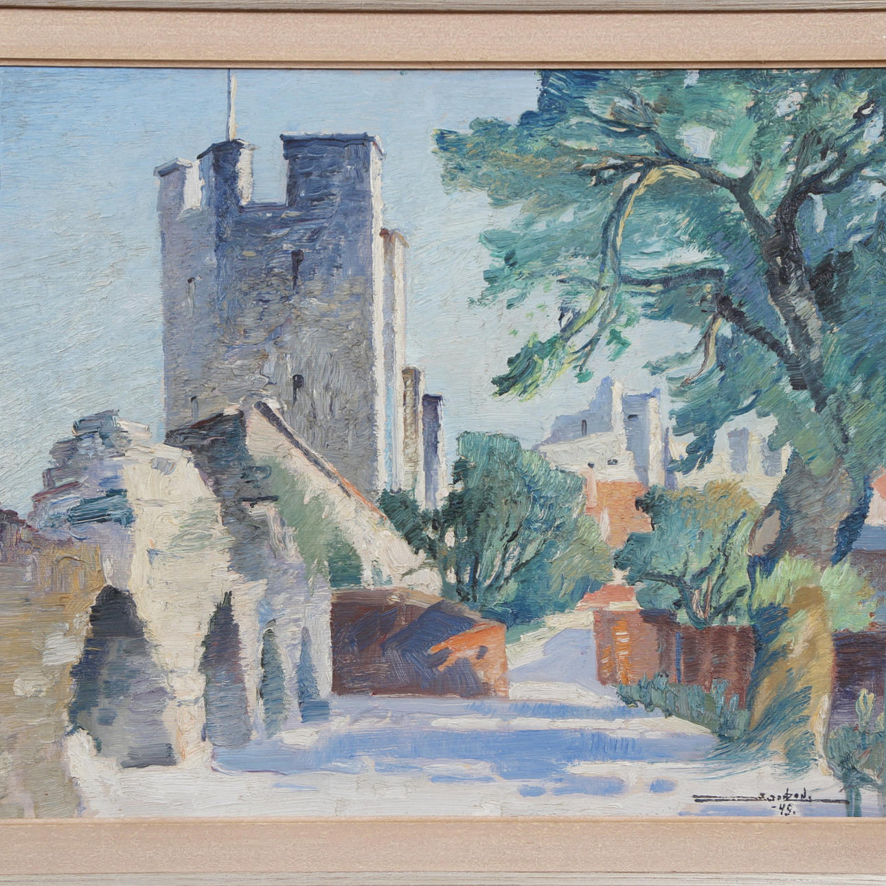 4456908. STIG JONZON. “SILVERHÄTTAN, VISBY IN DINNER LIGHT” OIL ON PANEL, SIGNED, DATED -49.