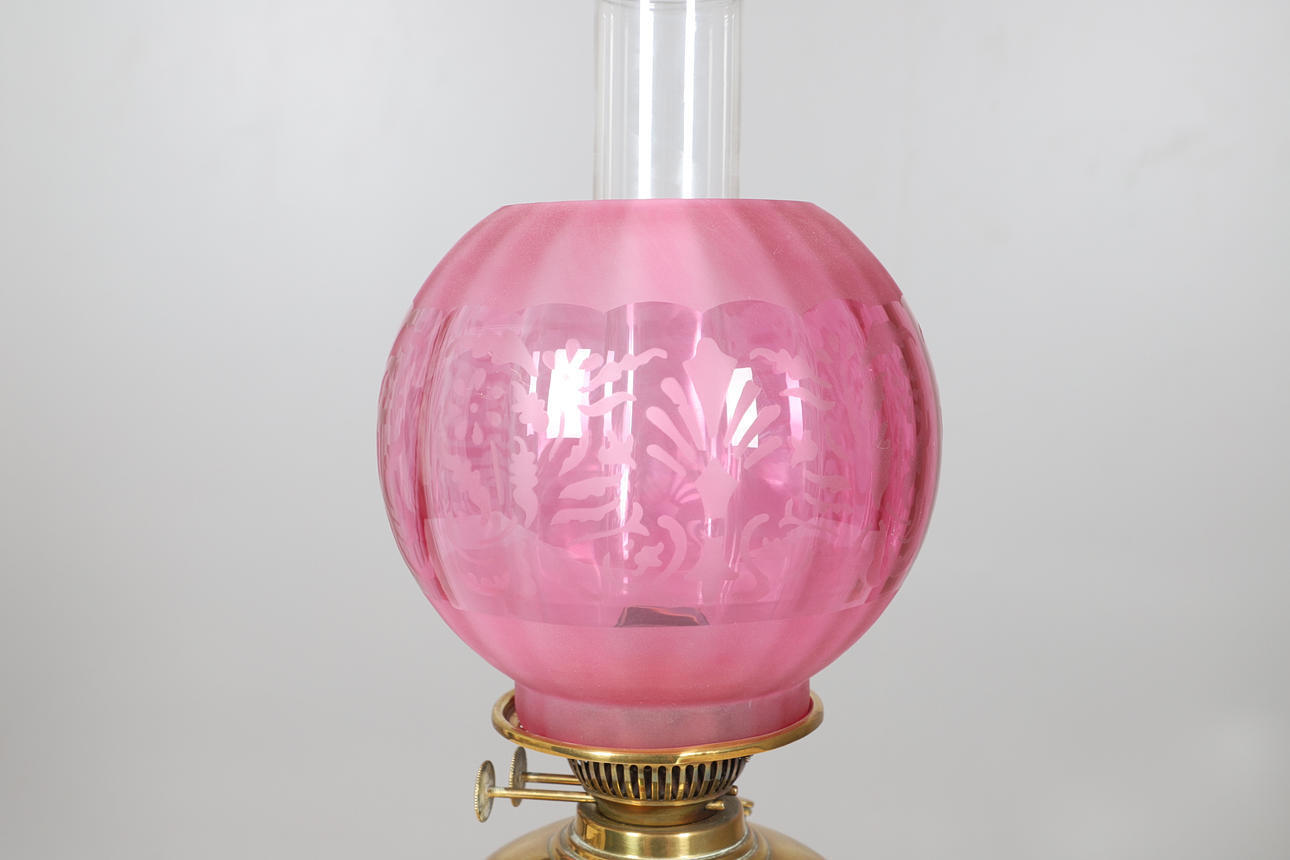 with etched cranberry glass shade and funnel, upon an ebonised base, 53cm high overall.