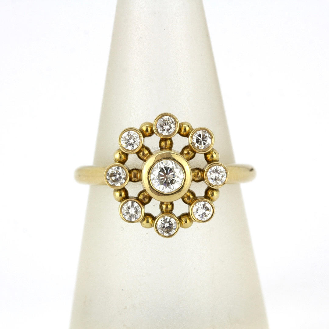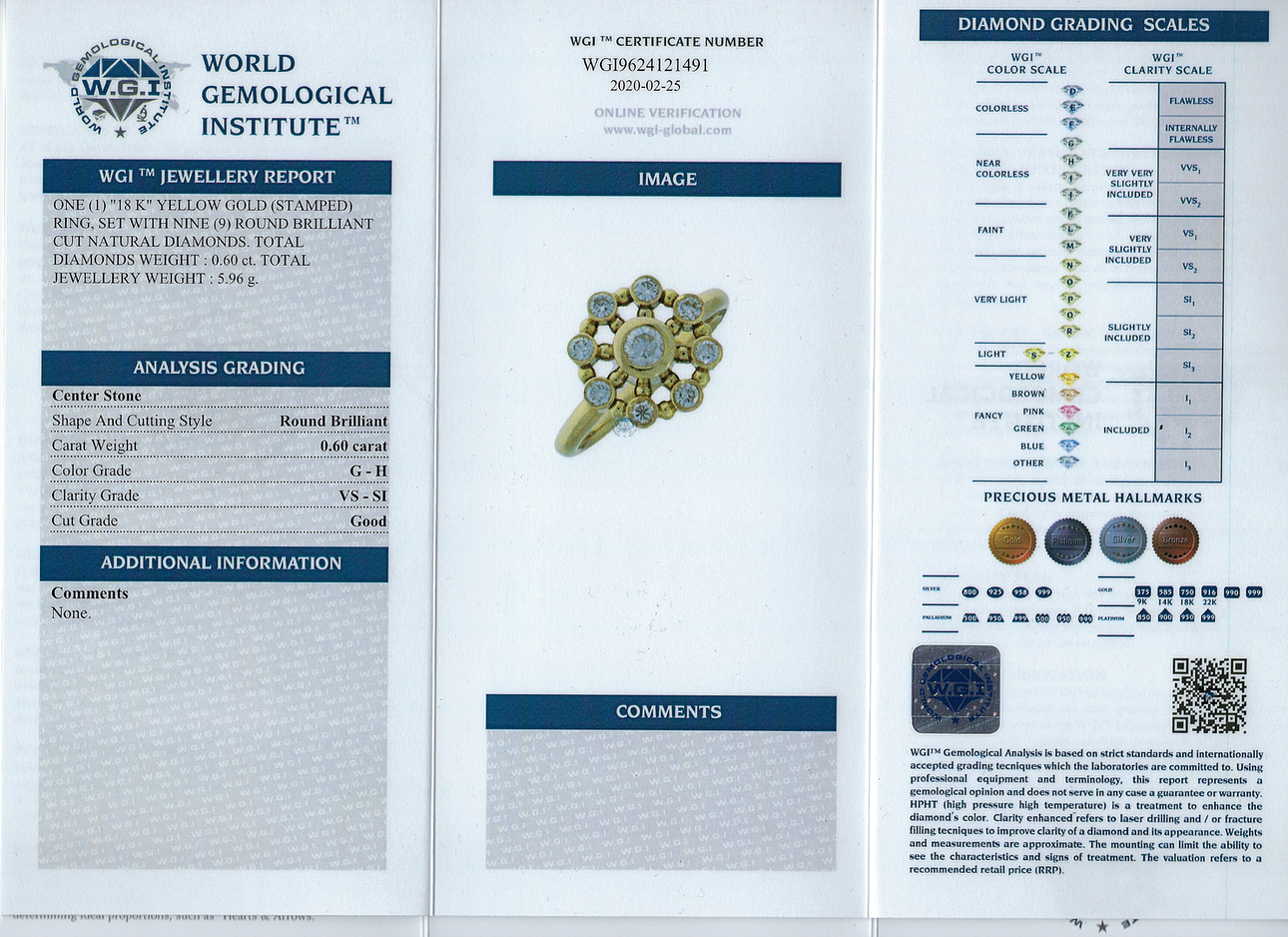 An 18ct yellow gold diamond set cluster ring set with brilliant cut diamonds, approx. 0.6ct. With WGI certificate, colour G-H, clarity VS-SI, UK ring size N.5.