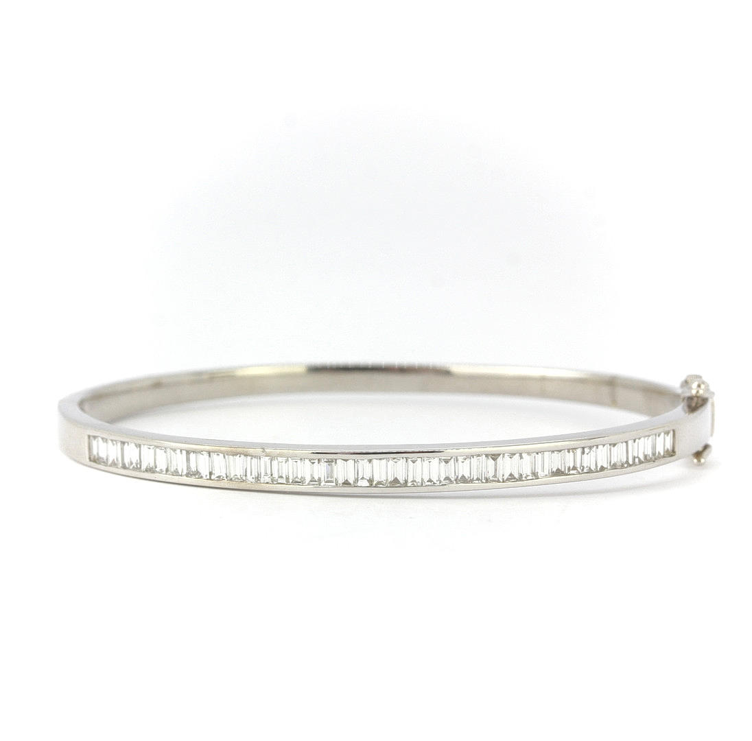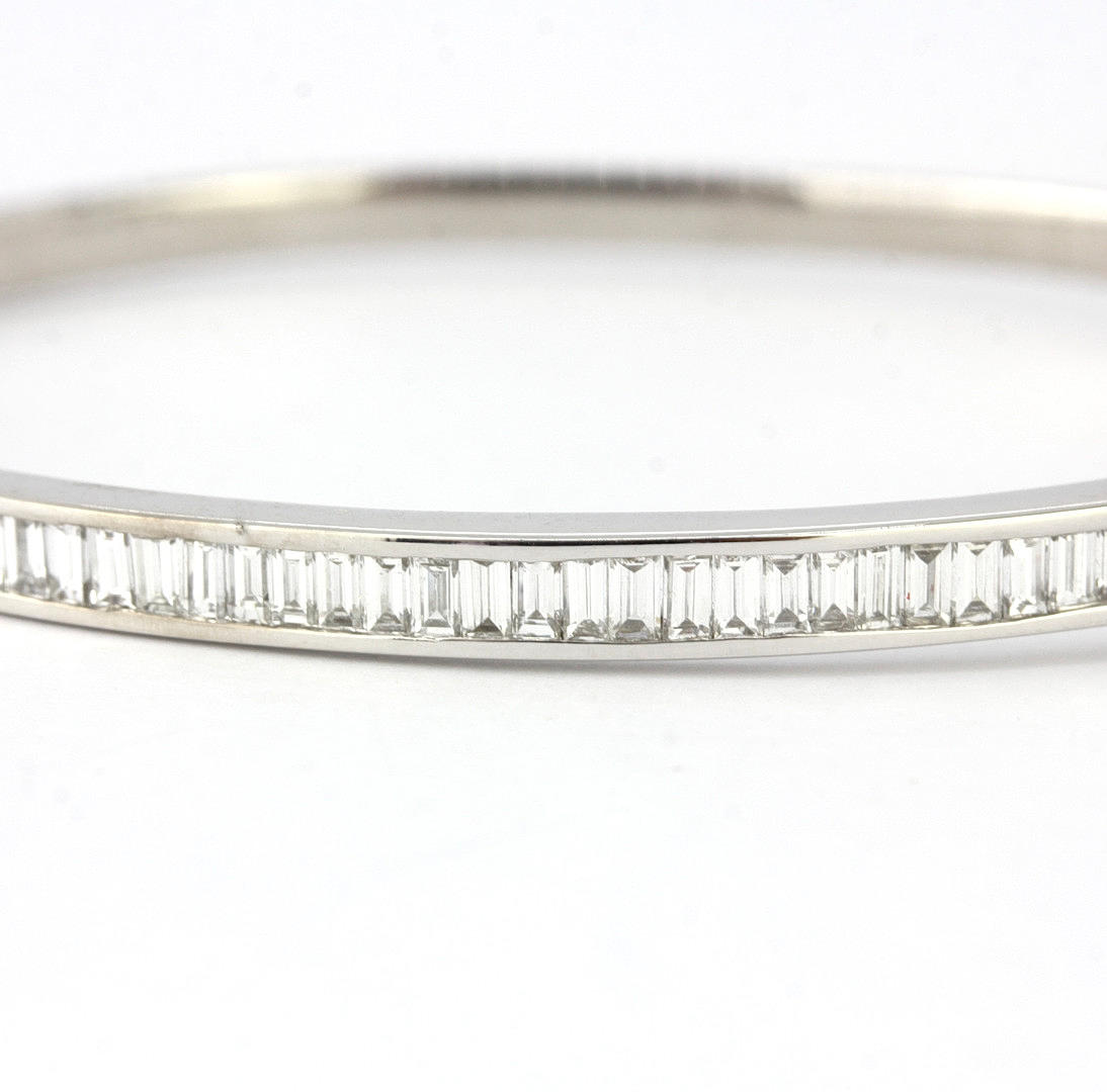An 18ct white gold bangle set with baguette cut diamonds, approx. 3.2ct overall, colour E-F, clarity VS1-VS2. With WFI certificate, approx. 11.9gr, length 5.3cm.