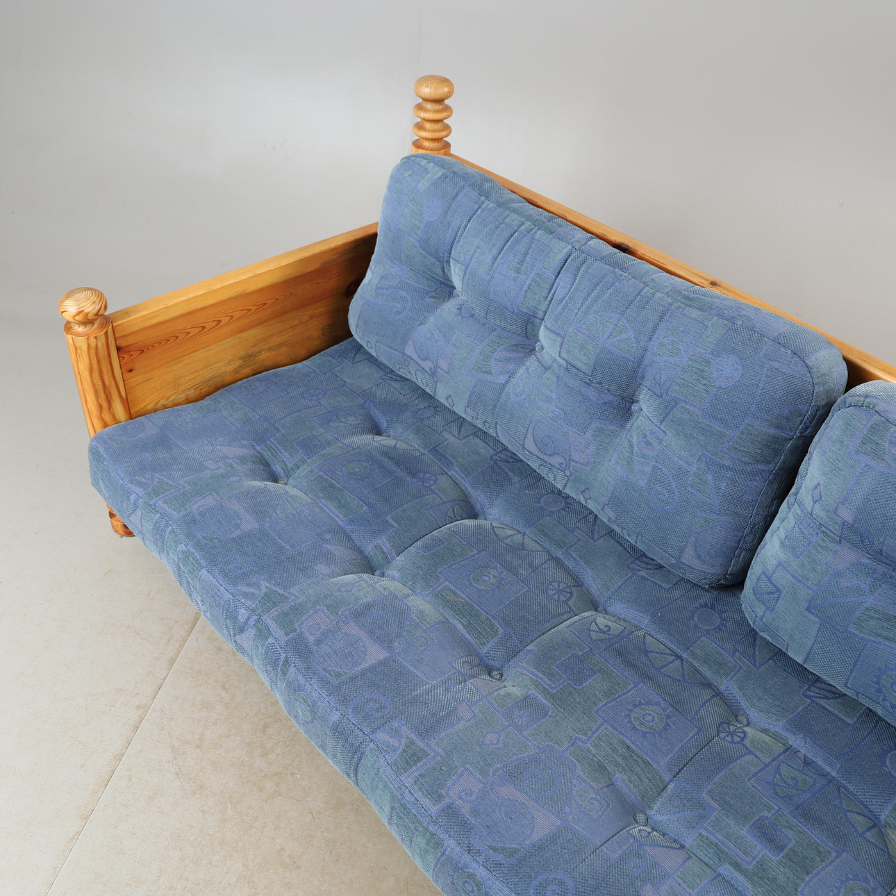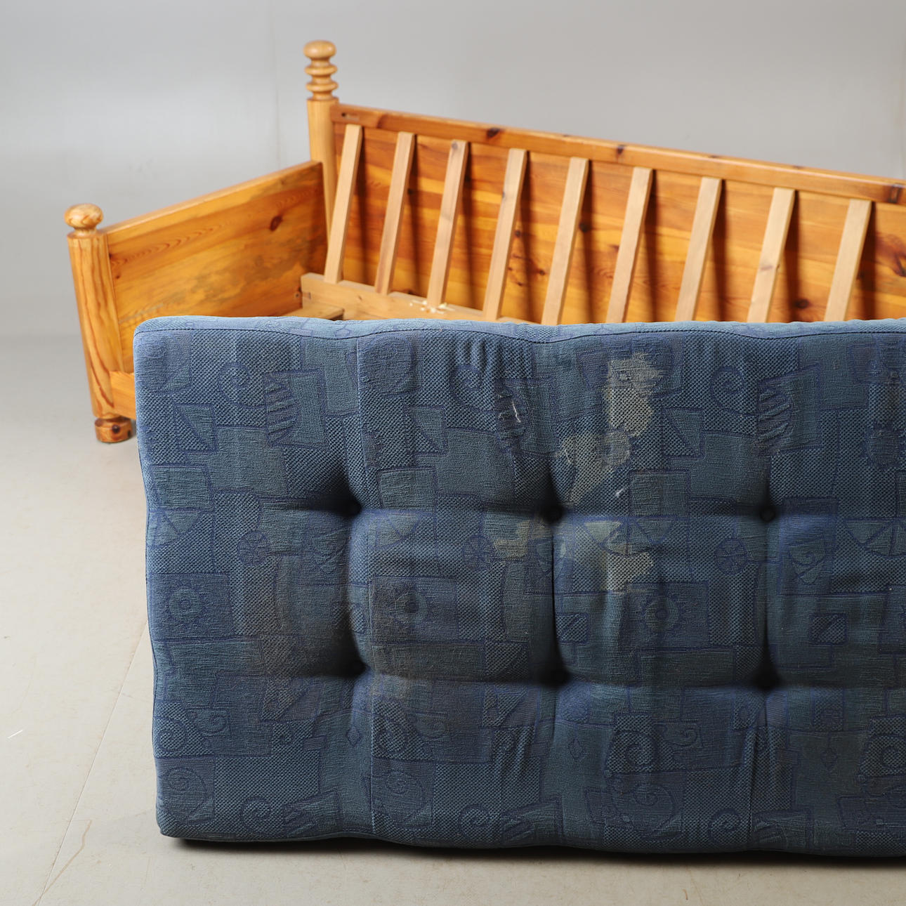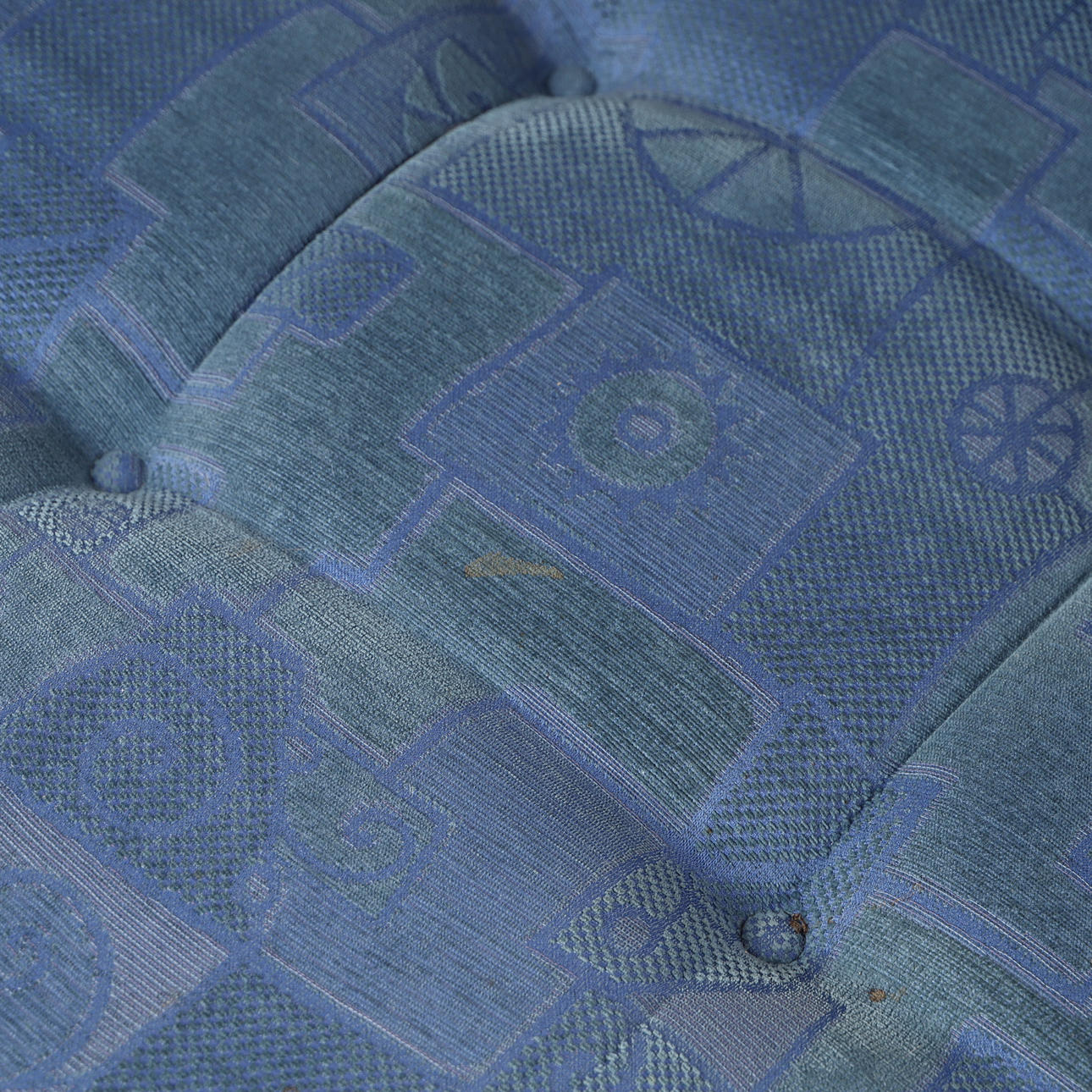 Normal wear and tear, temporarily mounted on picture, stains on textile.