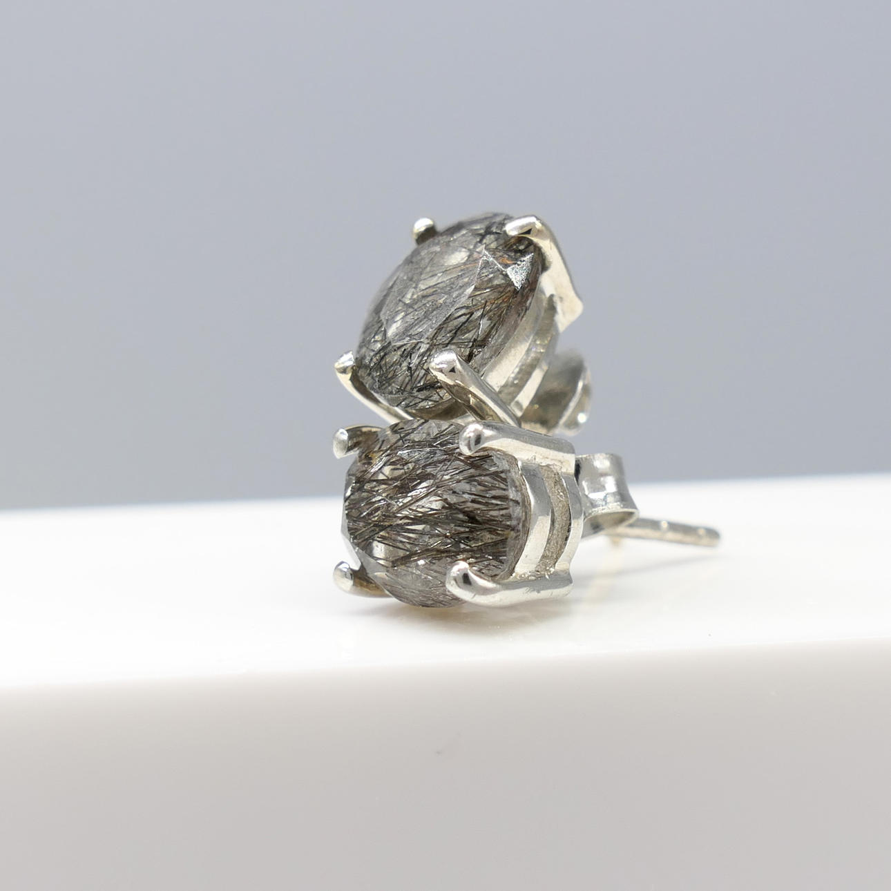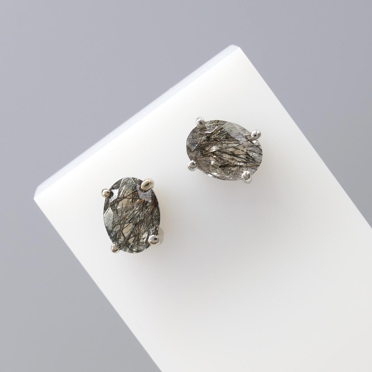 Gemstones: natural rutilated quartz; 2 x oval-cut; 1.60 ct total approx; 8 x 6mm each; naturally-occurring black acicular inclusions