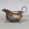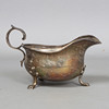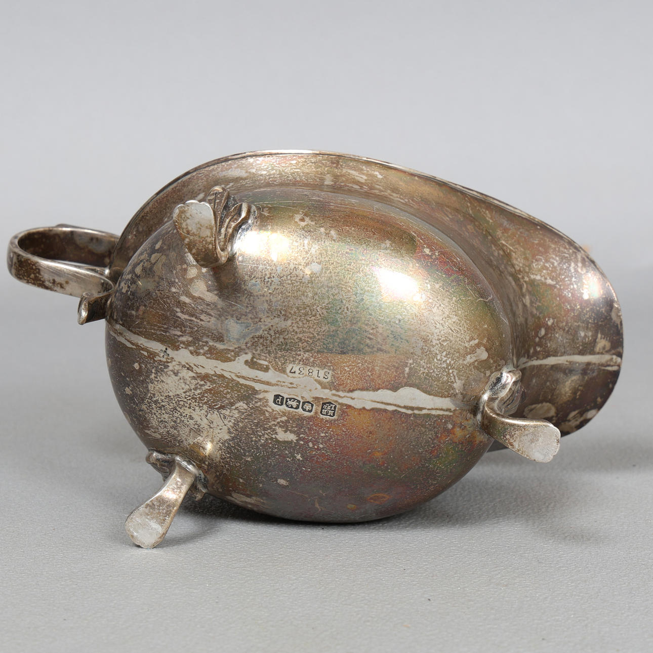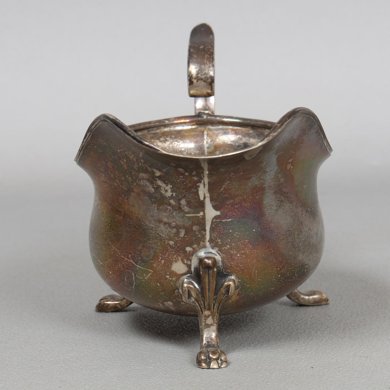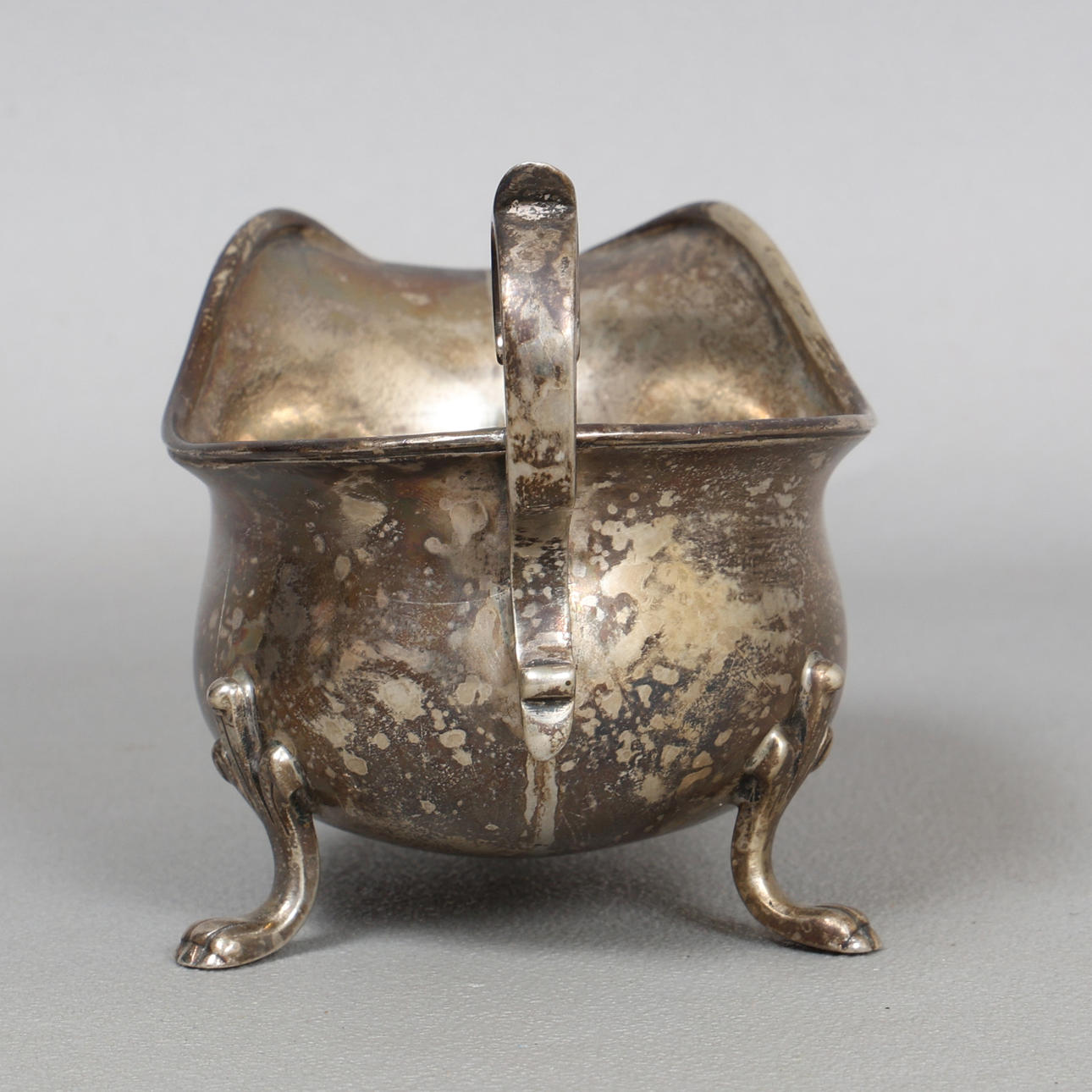 Sheffield 1932, maker M Beaver Ltd. with scroll handle, raised on three paw feet, 14.5cm wide, 8cm deep, 9cm high, 5.2oz.