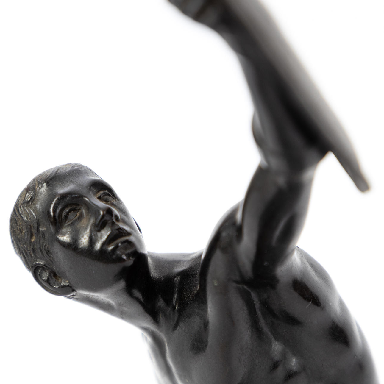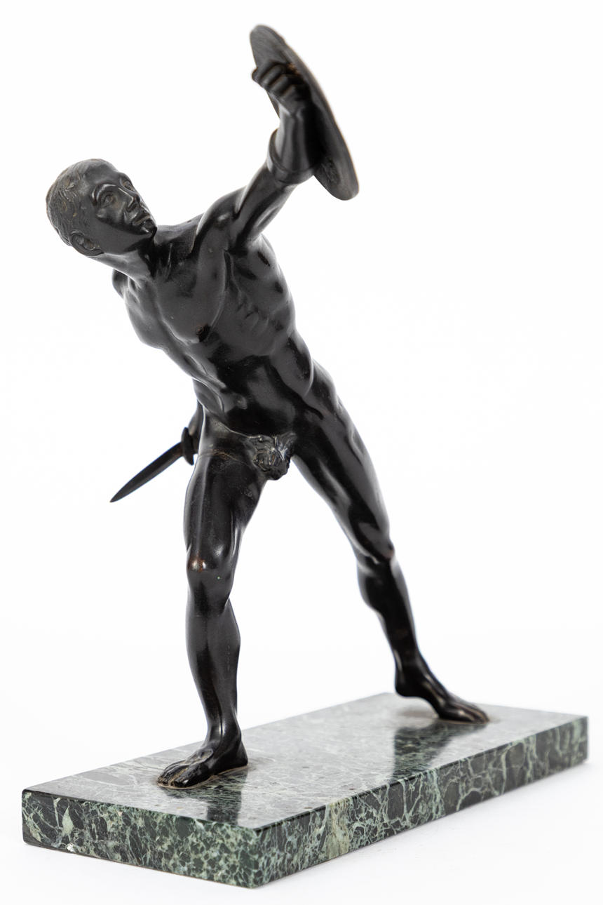 Bronze, patinated dark brown/ green marble veined in shades of green. After St. Male act in defensive position with raised sign. In real hand, the short sword. Rectangular plinth H.: approx. 28 cm.
