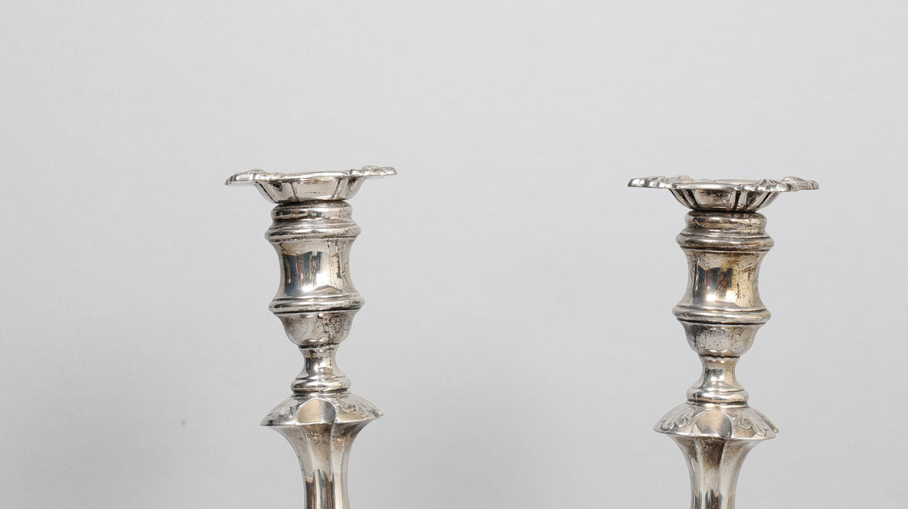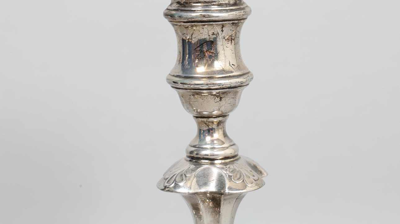 One of the sticks appear to have been broken and repaired to the centre of the stem, both sticks are slightly bent, hallmarks to the base of one of the sticks are rubbed, scratches, dents and marks throughout.