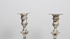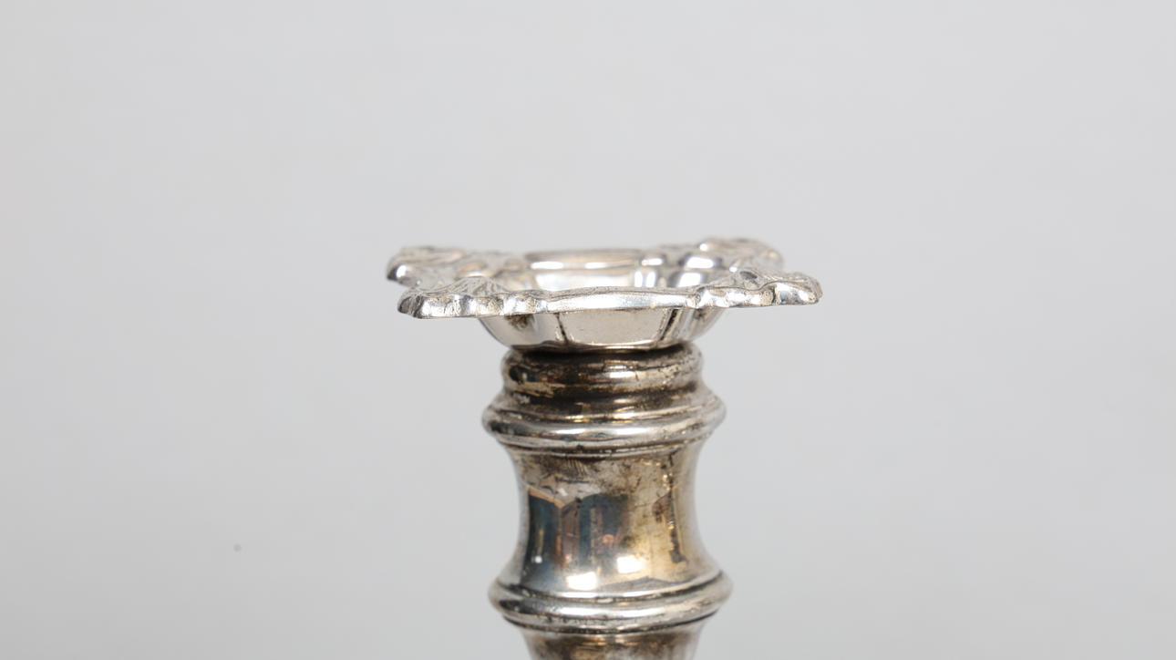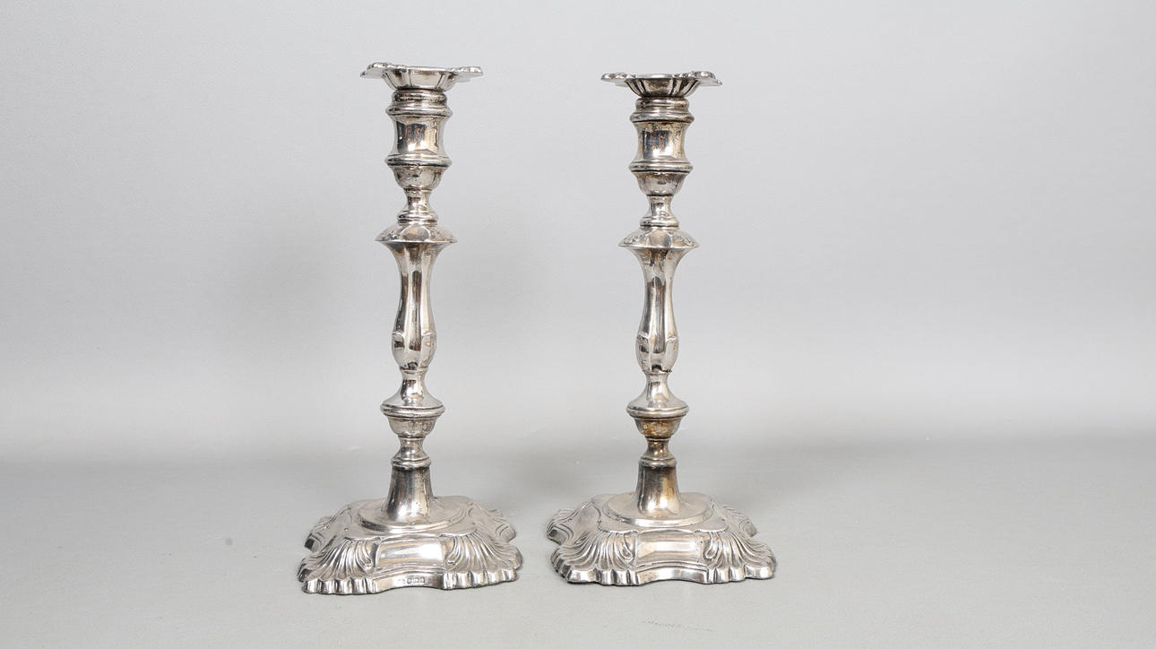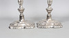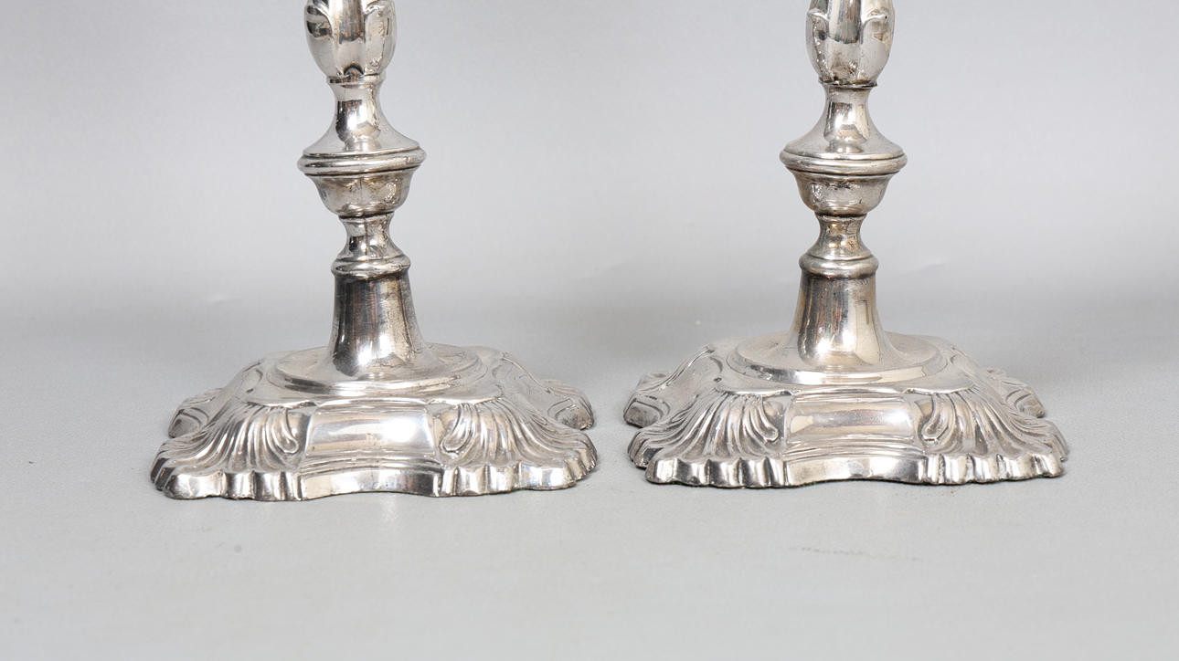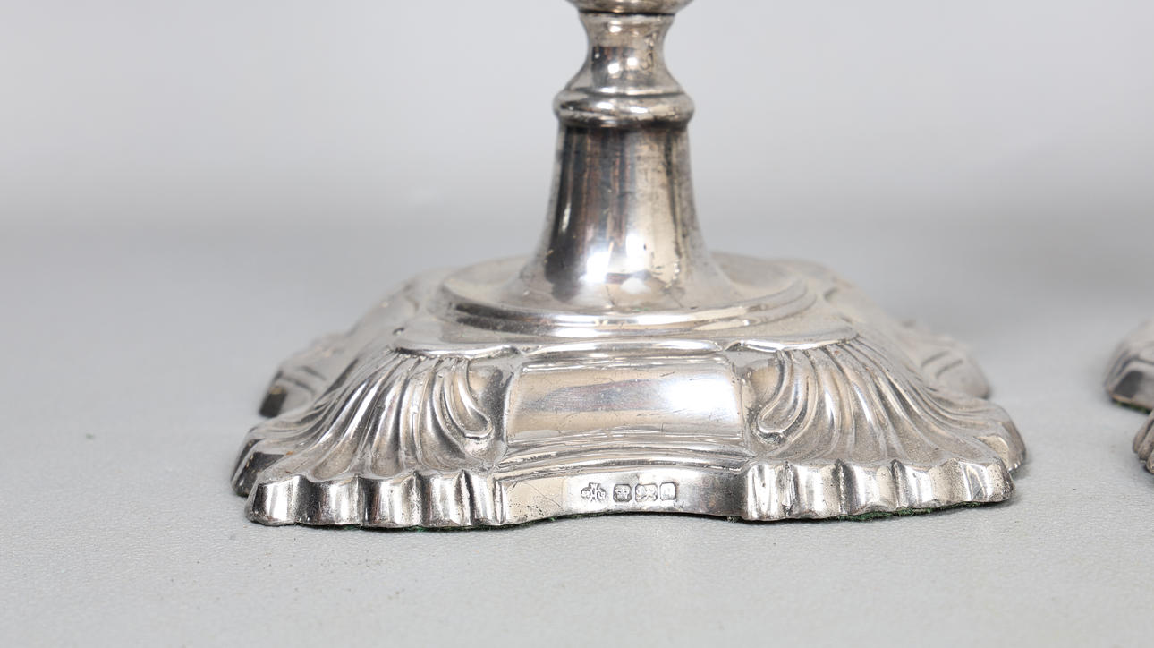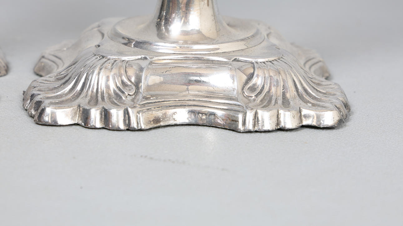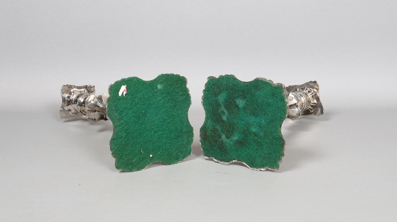 Sheffield 1908, maker William Hutton & Sons Ltd. the detachable shell cast sconces above waisted quatrefoil stems and acanthus leaf cast loaded bases, 13.5cm wide, 13.5cm deep, 30cm high.