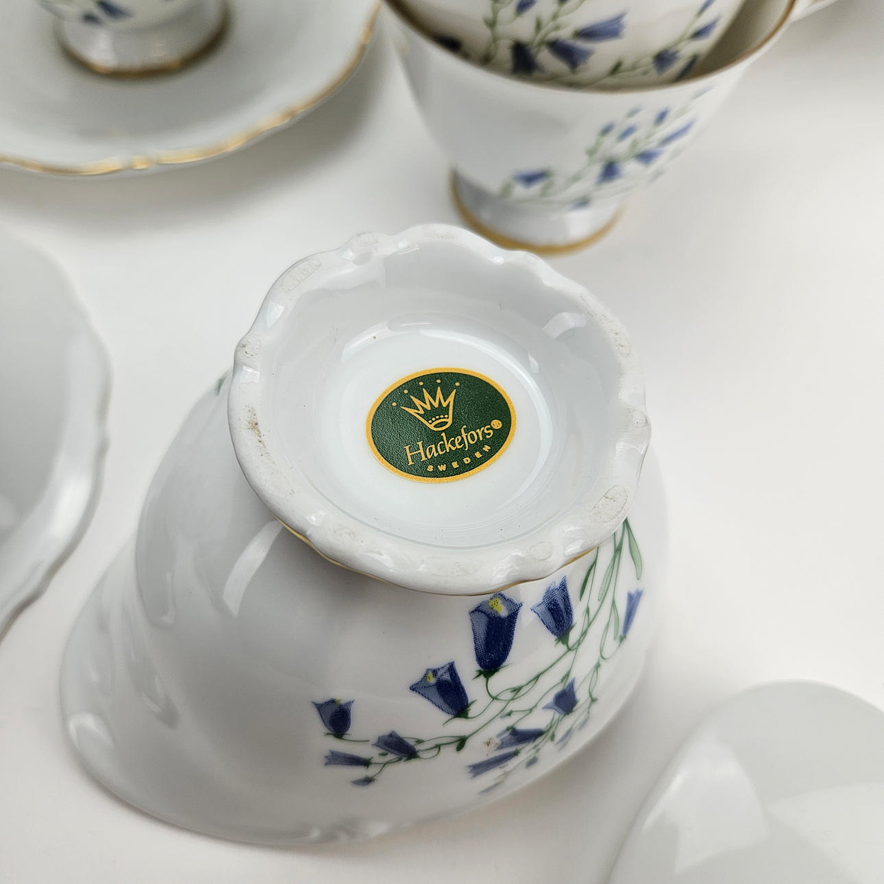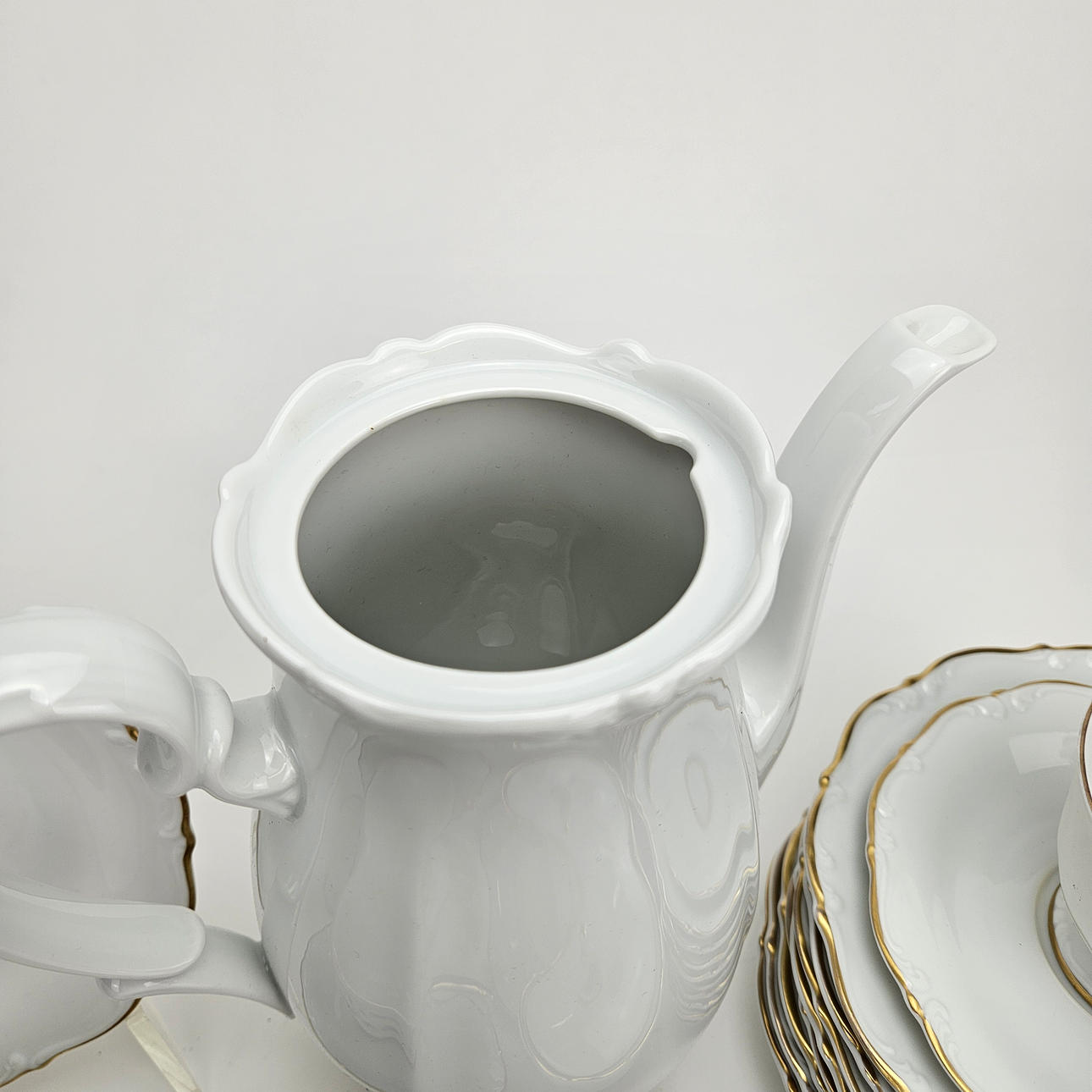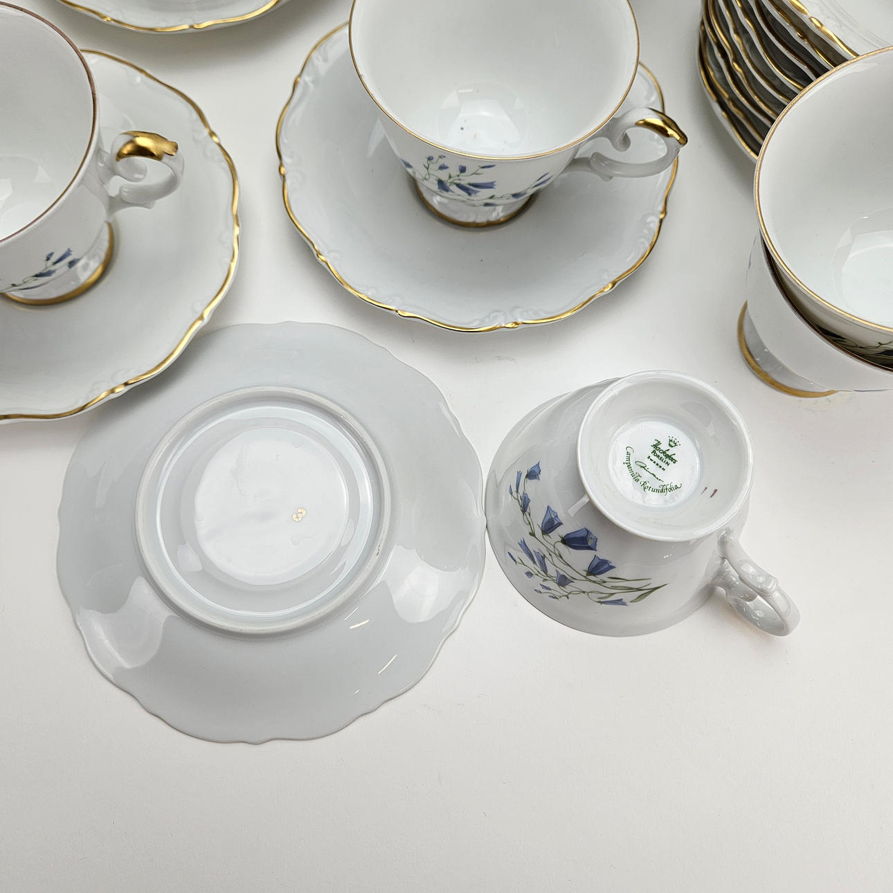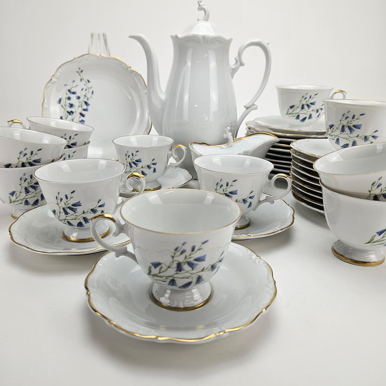 14 coffee cups with saucer, 10 side dishes, sugar bowl, coffee pot.