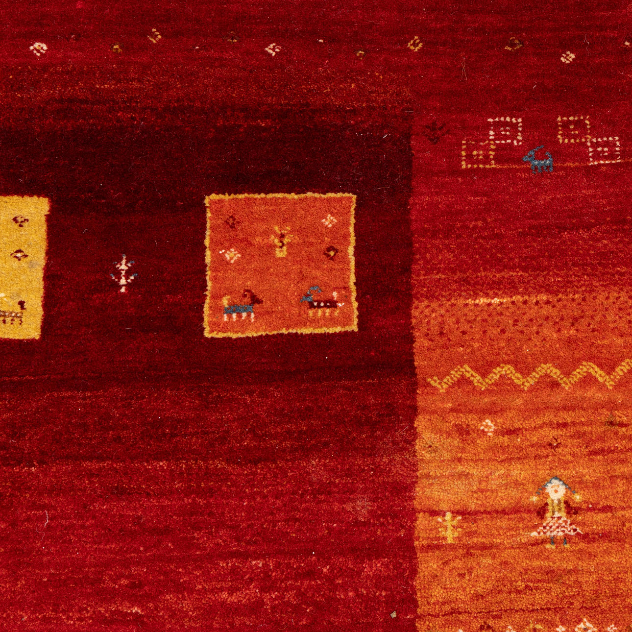 Hand-knotted rug in wool, gabbeh style, figural elements on rust-red base.