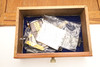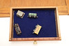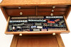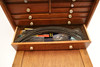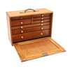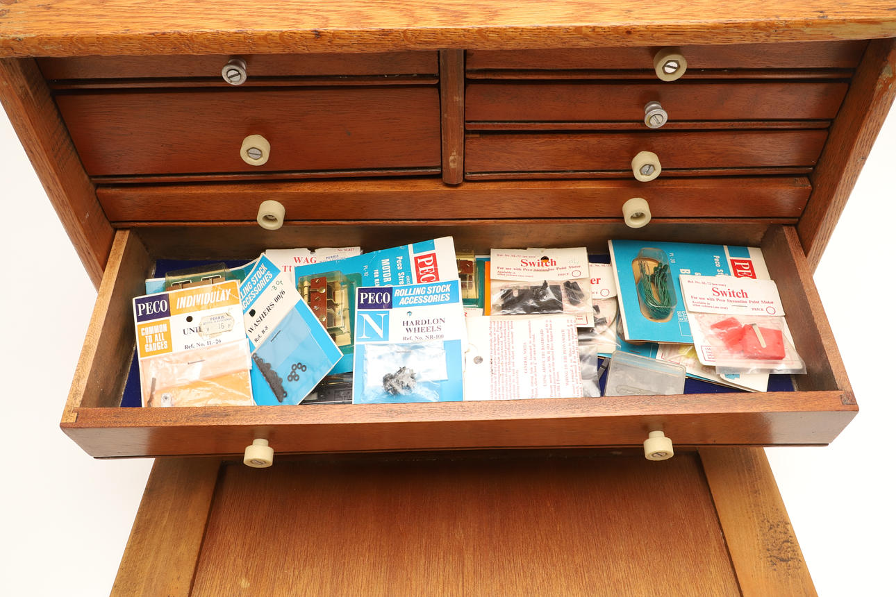 comprising of six locos, wagons, carriages, track, various Peco parts (some new/unused), all within a handmade lockable oak case of eight drawers, 34cm high x 46cm wide x 19cm deep, track length 80cm.