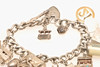 The curb link bracelet with padlock clasp and multiple charms attached including one 9ct gold "21" charm, total gross weight 92g.
