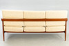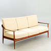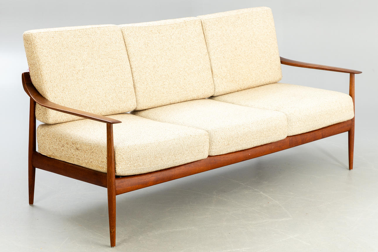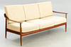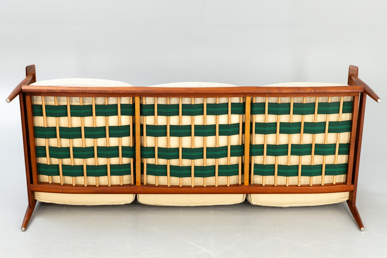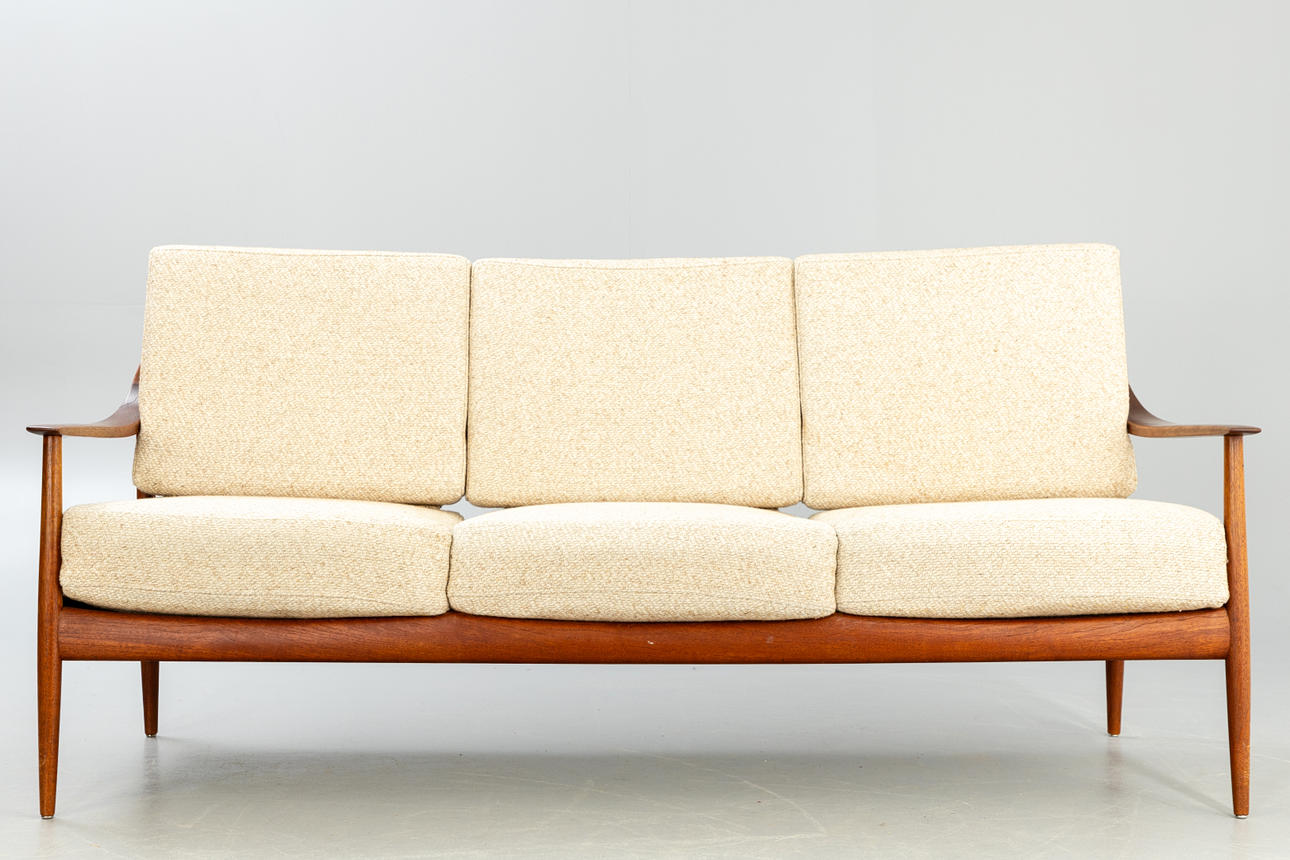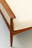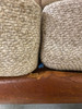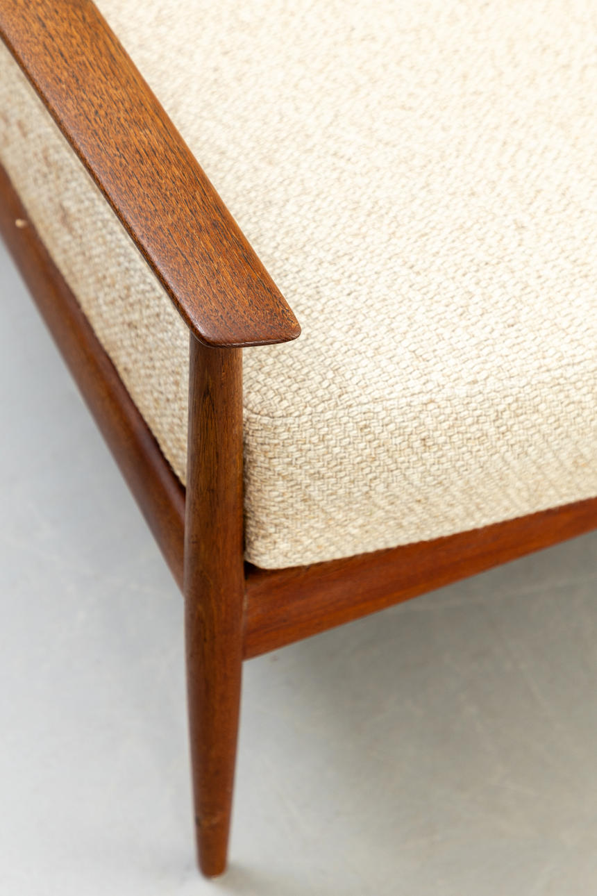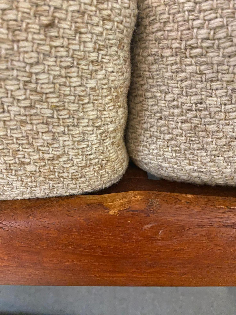Teak wood frame Loose padded cushions covered with wool blend fabric.