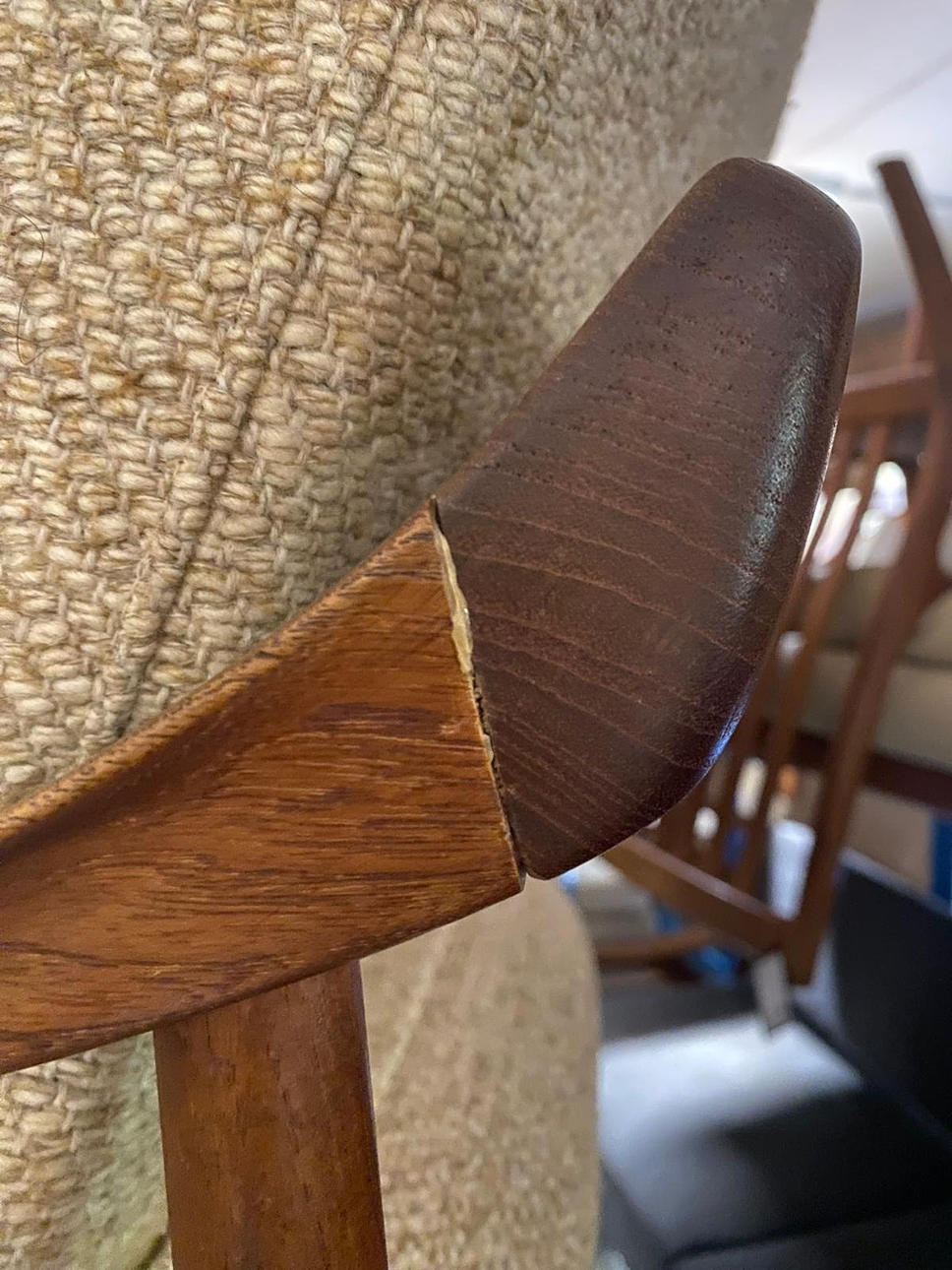 Signs of age and use. 2 deep notches in the wood on the front crossbar of the seat. Gluing on one side of the backrest partially loosened (see photos).