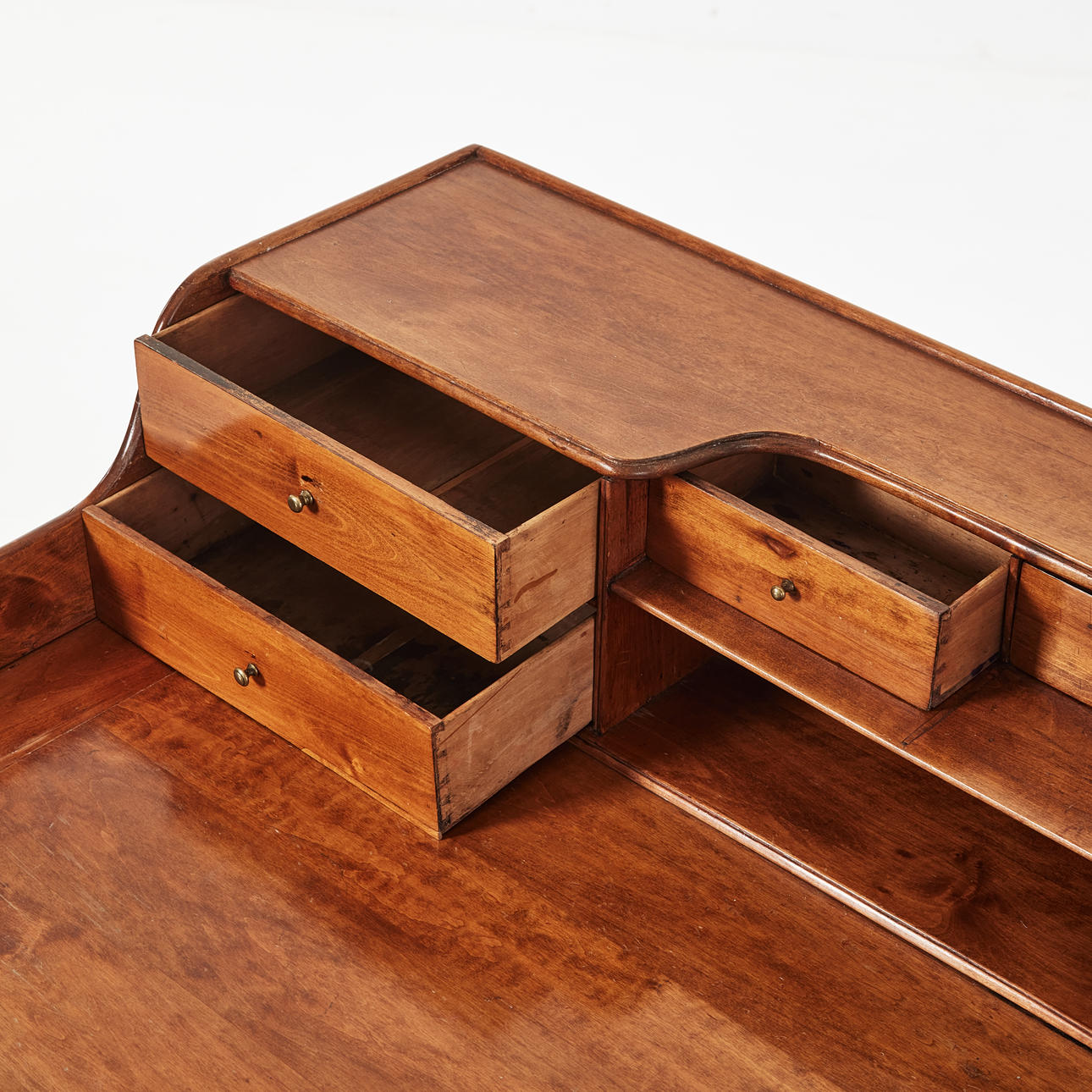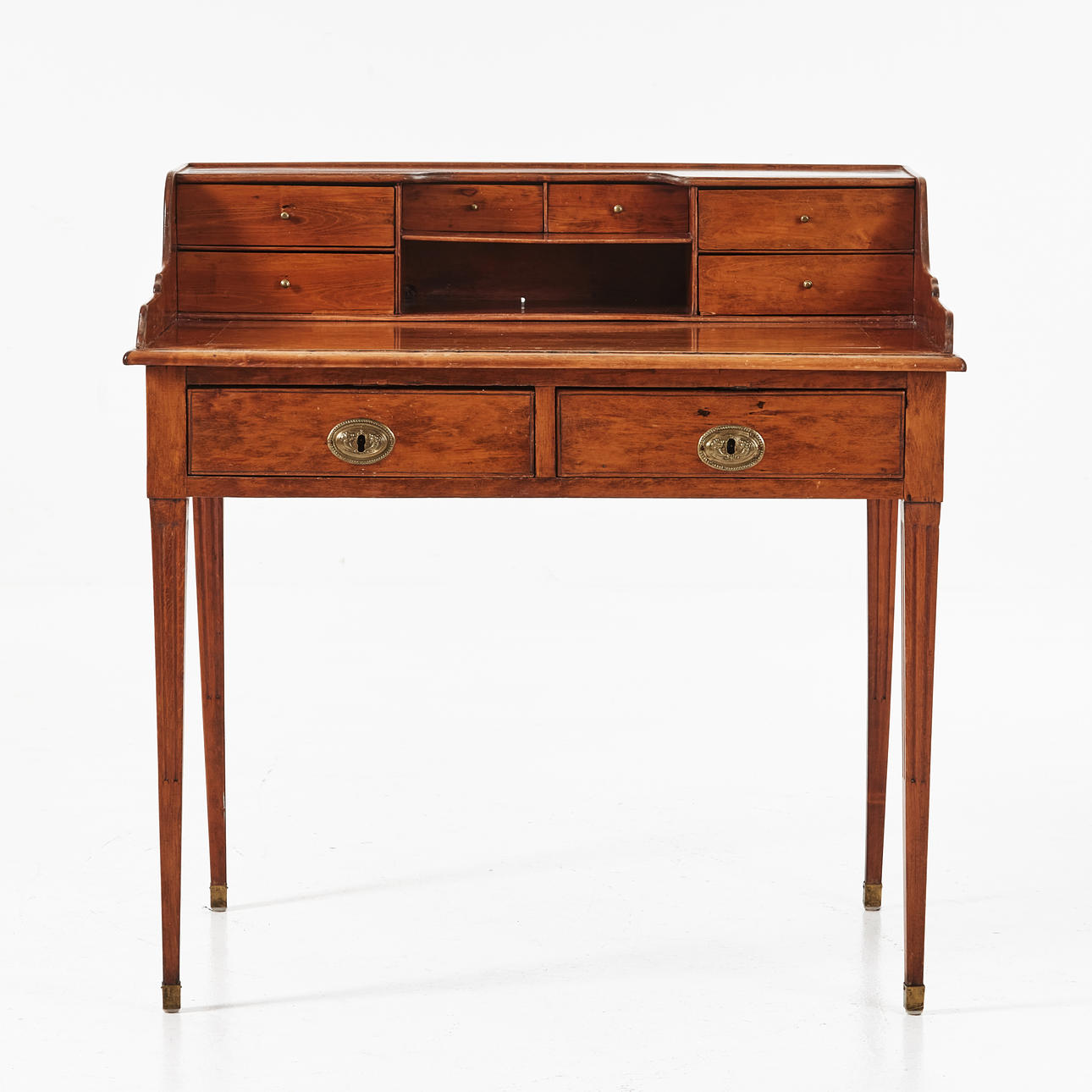 Birch, partly solid, cannellated legs, brass fittings, cannellated and brass shod legs, with drawers, dimensions approx. 95, 94 x 64 cm.