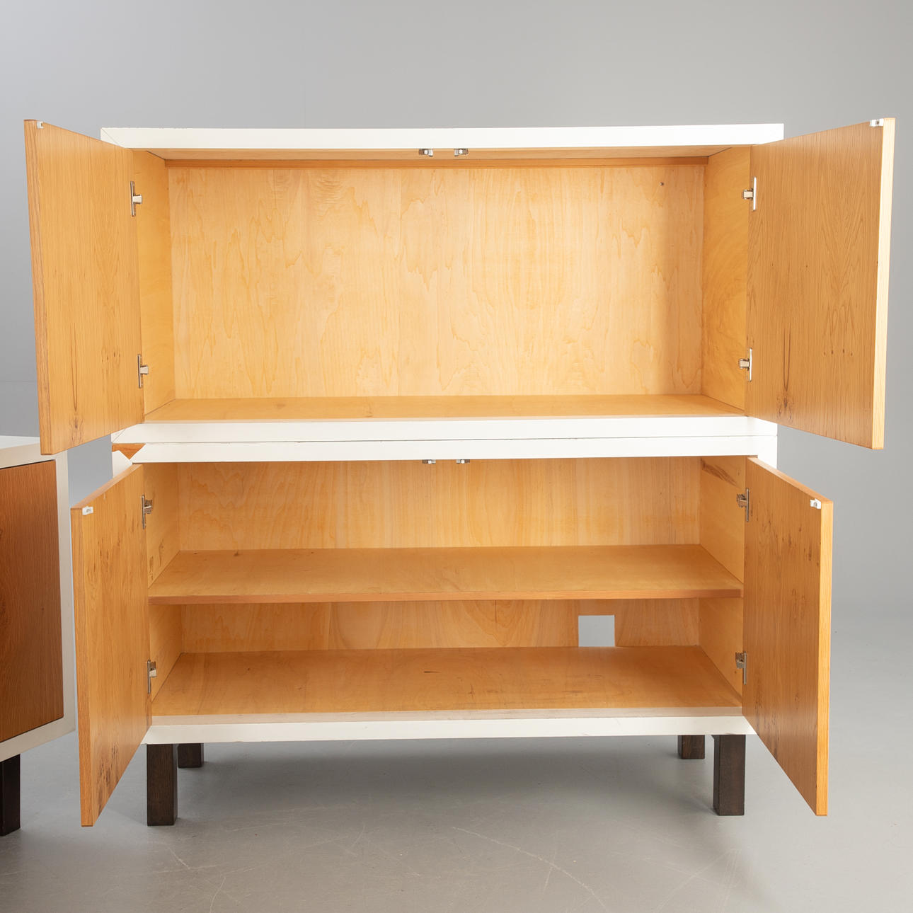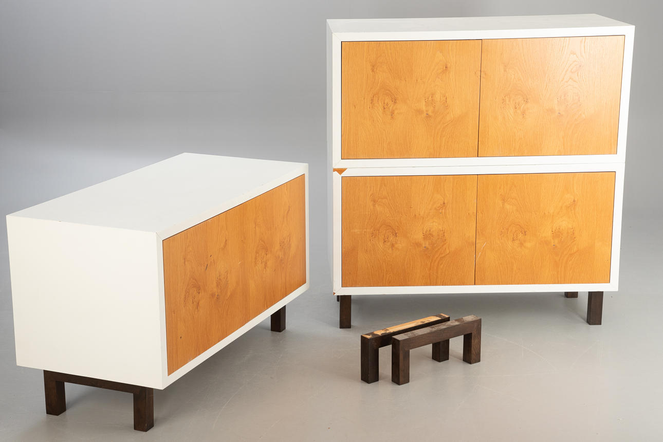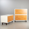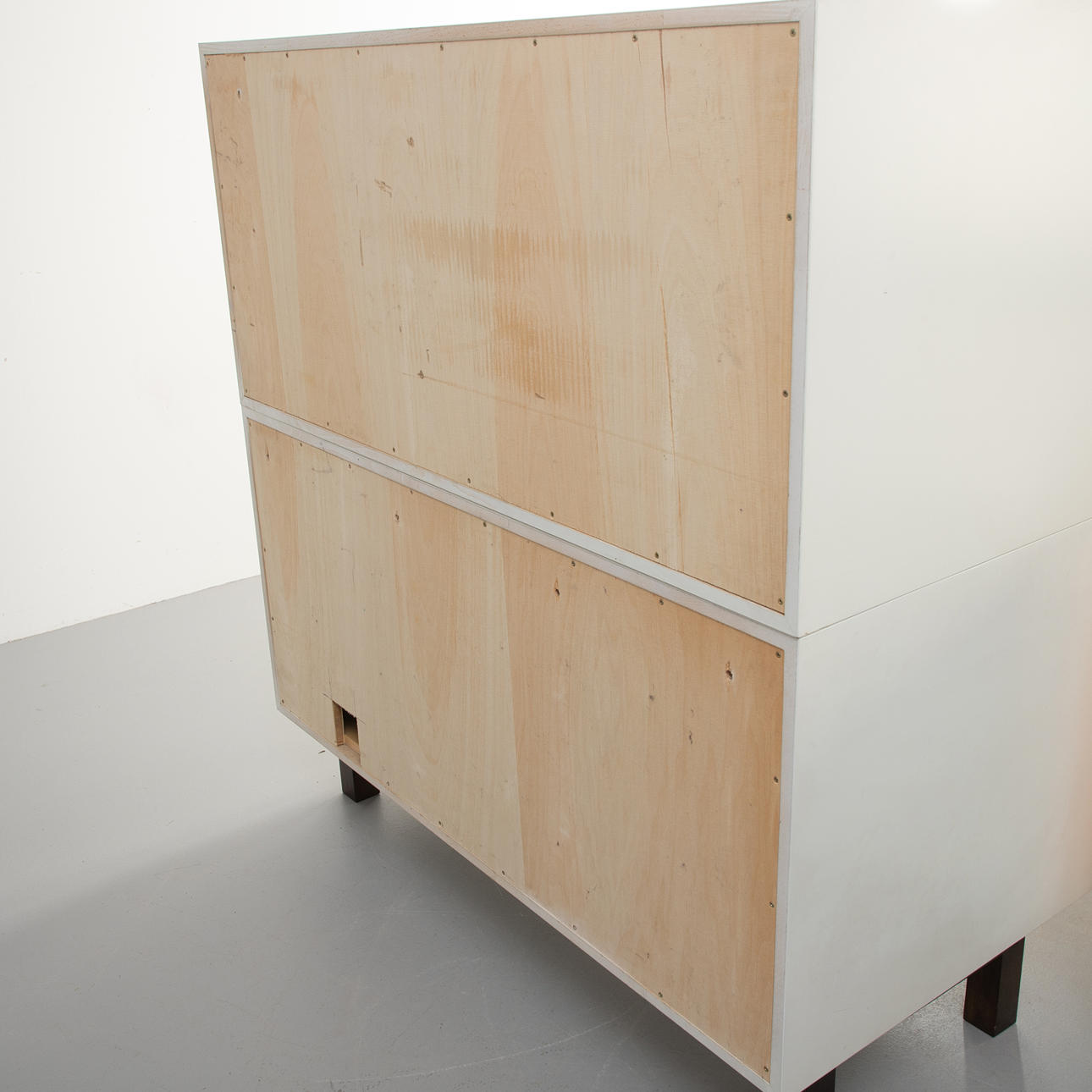 Wood construction, partially veneered or coated with white. Chests of drawers can be arranged variably side by side or on top of each other.