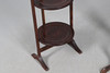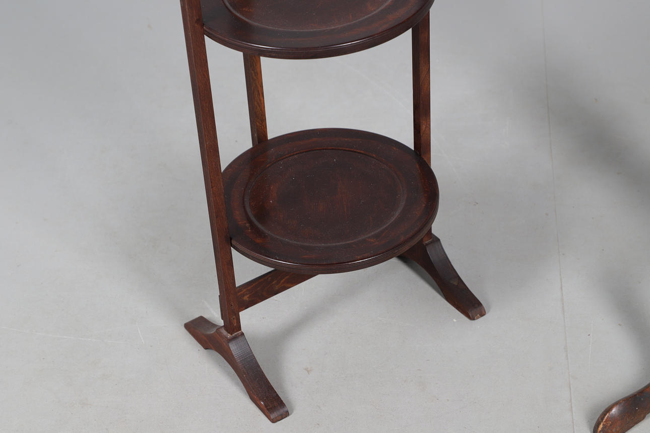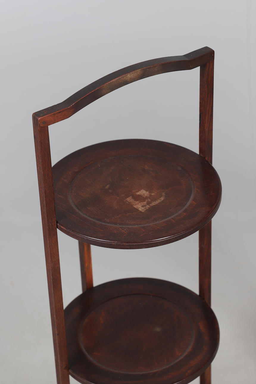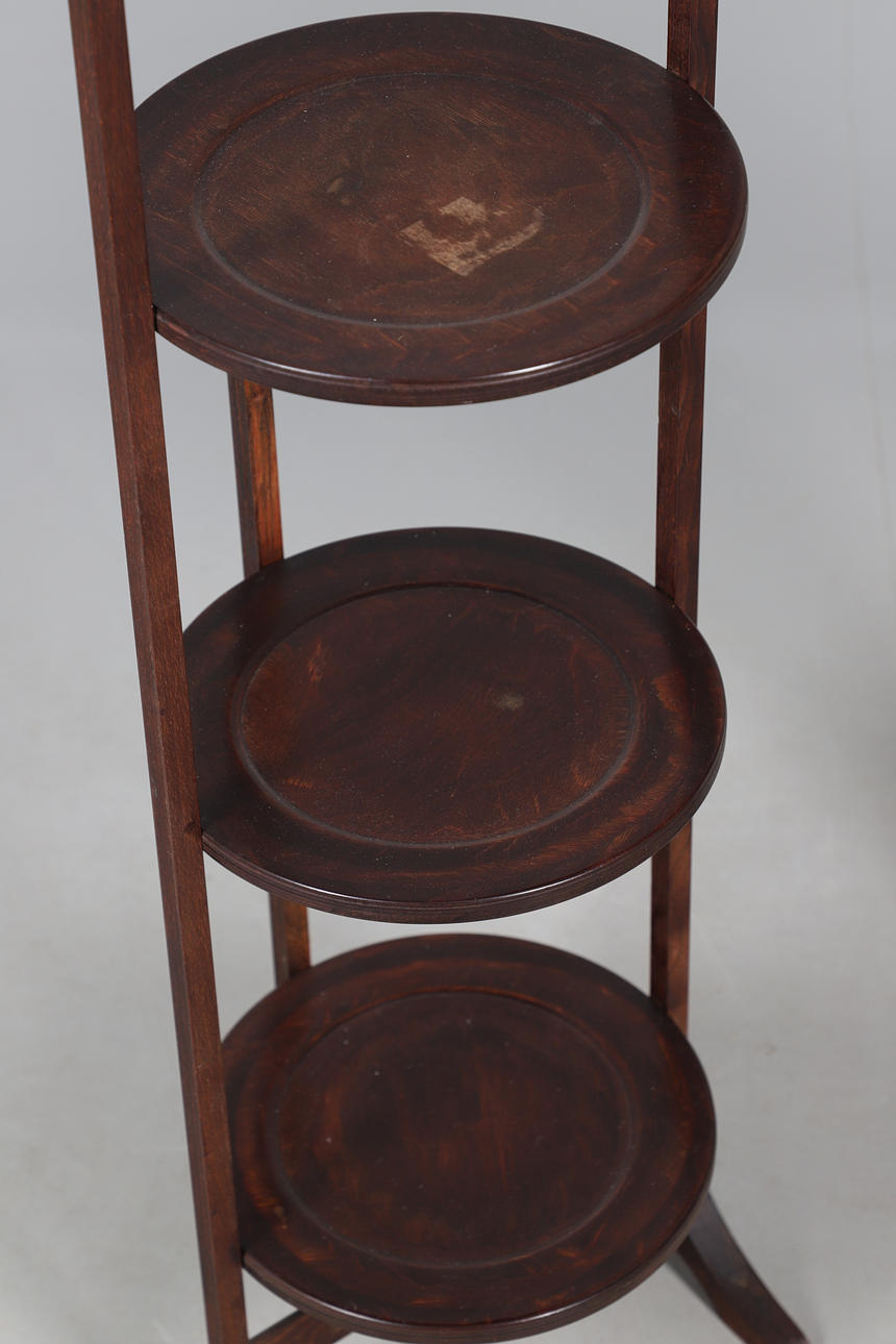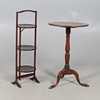 Mahogany tripod table with a rounded top, turned column on a tripod base. Height 70cm, diameter 44cm. Together with a 3 tiered cake stand, height 83cm.