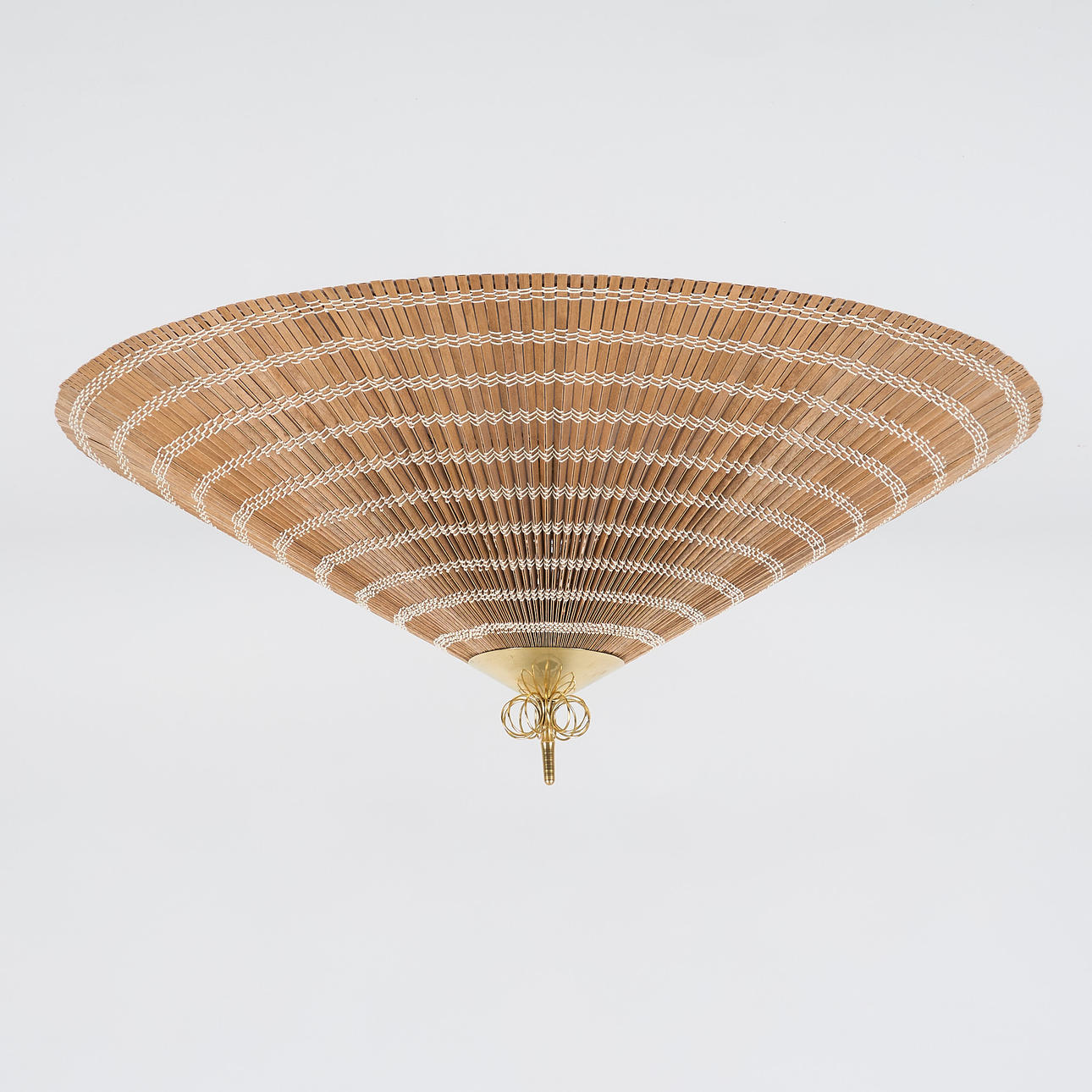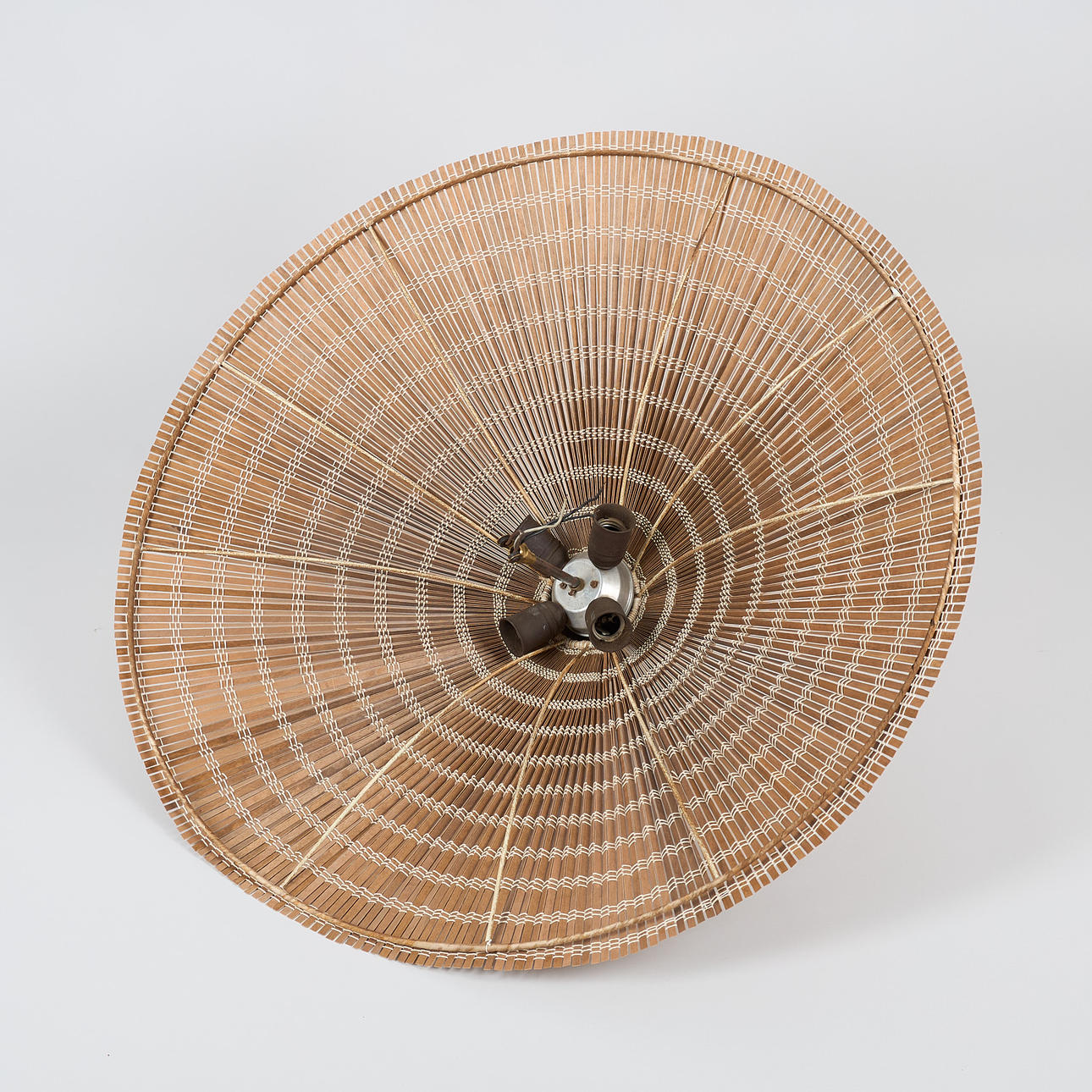 Polished brass and lampshade made of aspen splinters. three points of light. Diameter 82 cm, height approx. 30 cm.