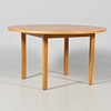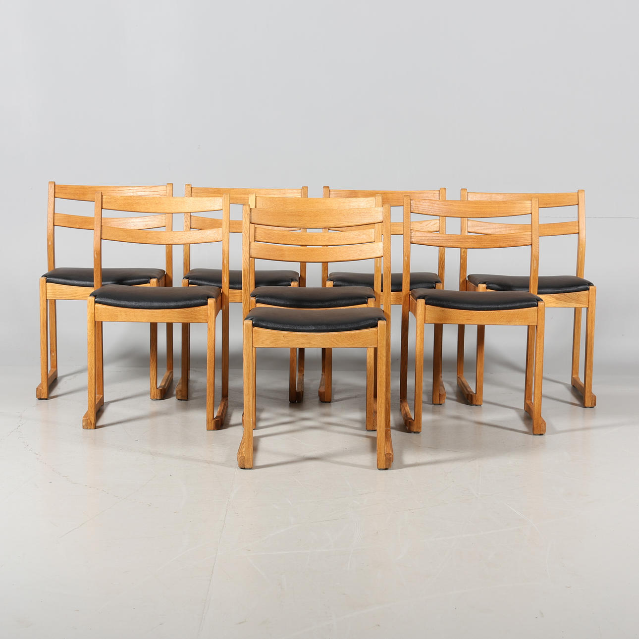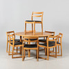 1 table, height 73 cm, diameter 130 cm 8 chairs, height 75 cm, seat height 45 cm.