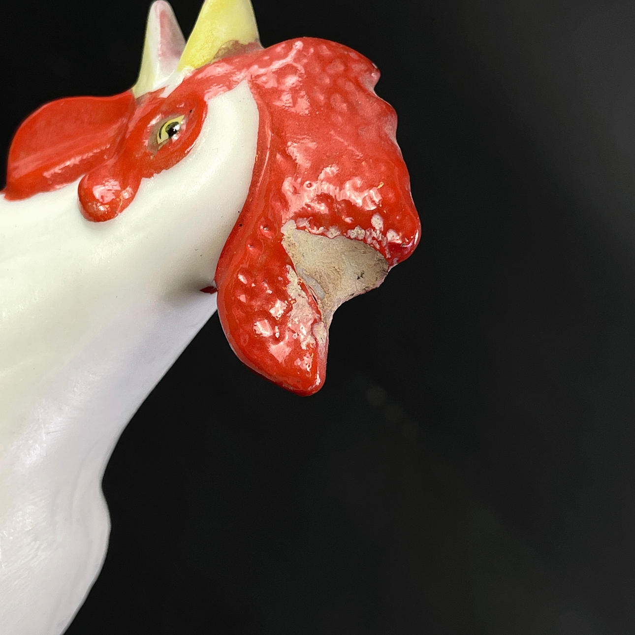 Normal wear and tear, a rooster with a rooster comb rejection.