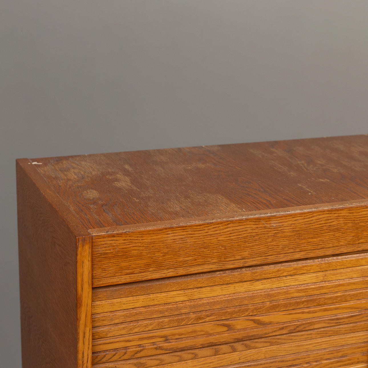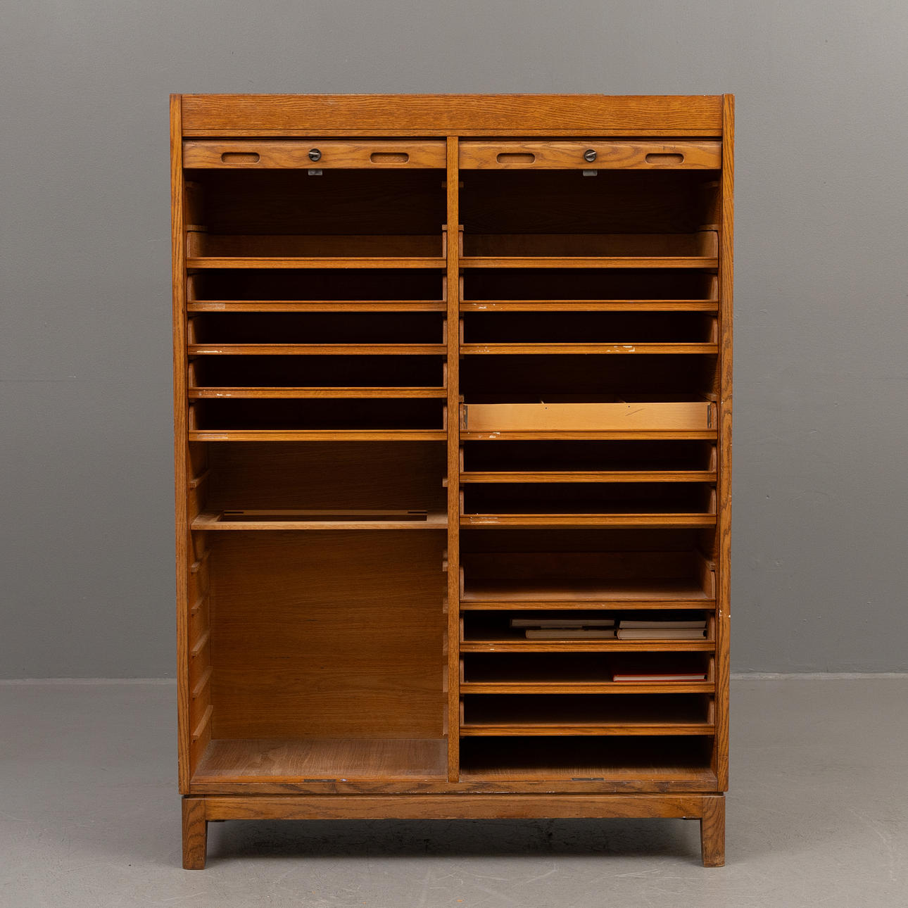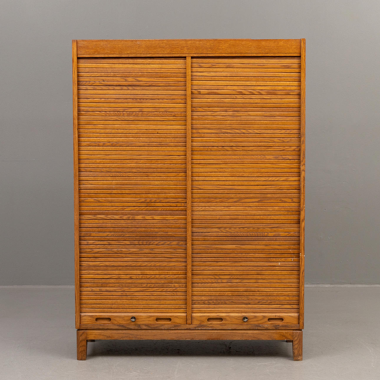 Double filing cabinet in oak veneer with roller shutter doors.