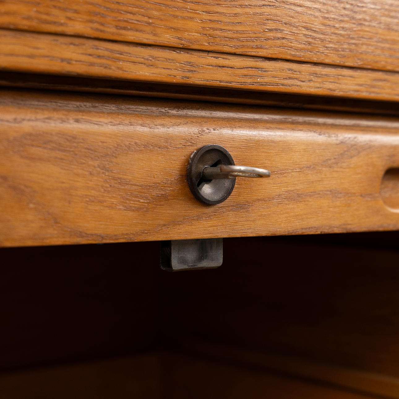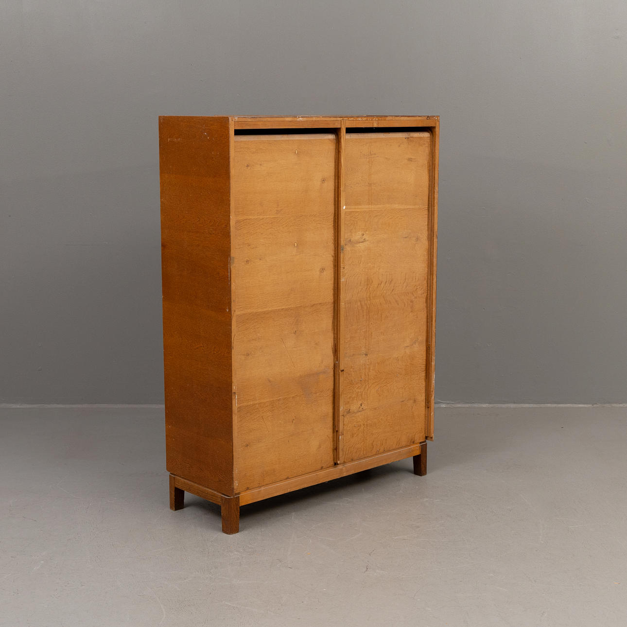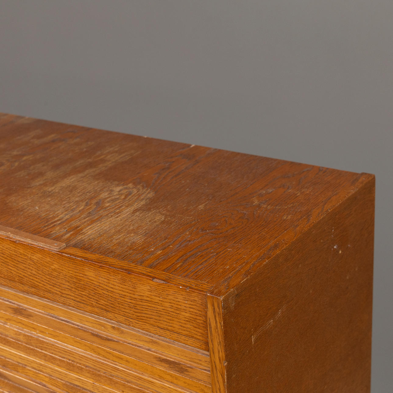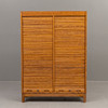 Double filing cabinet in oak veneer with roller shutter doors.