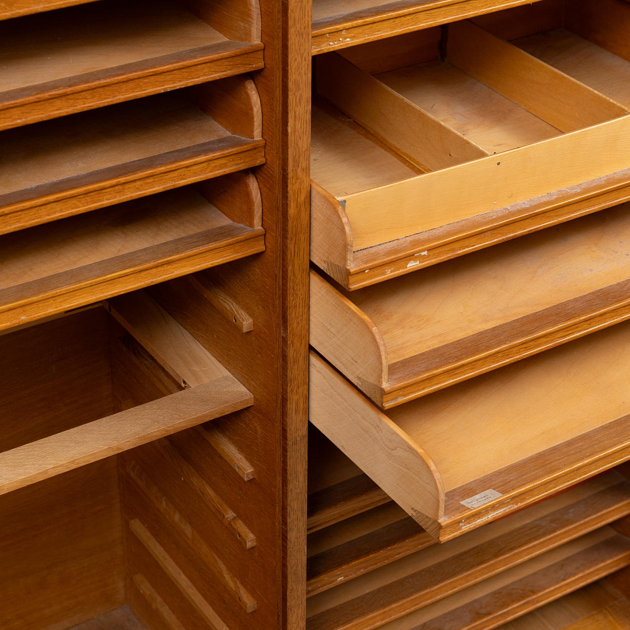 Normal wear and tear, scratches and marks, a number of pull-out drawers are missing.