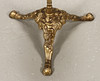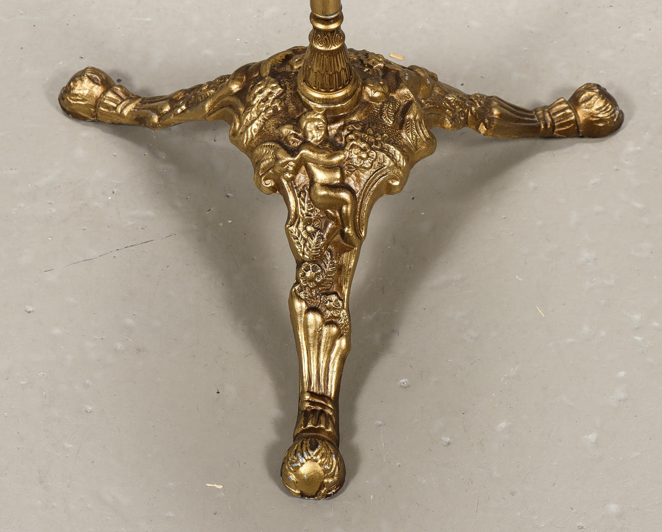 Gold-colored metal pillar base. Board with laminate/stone imitation.