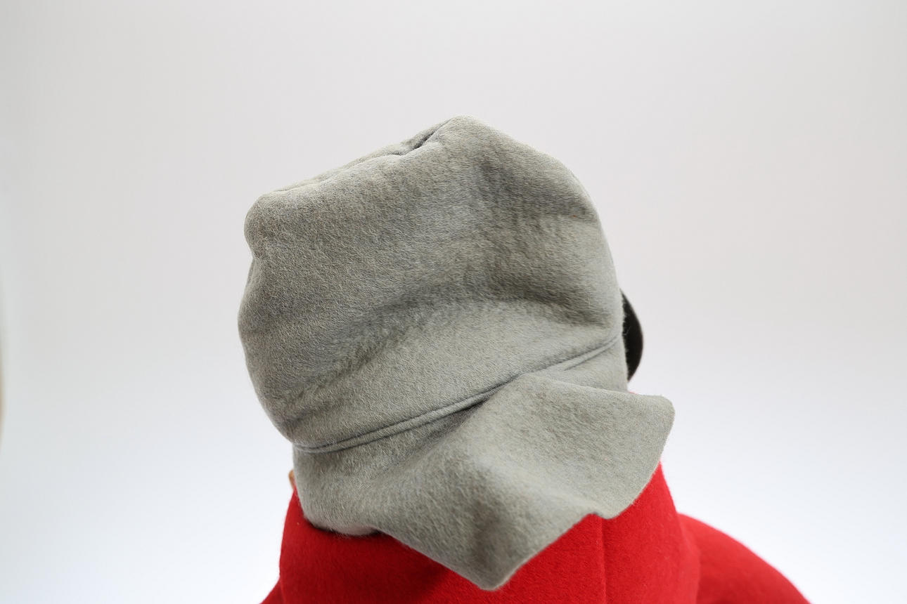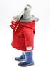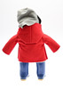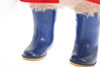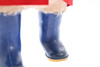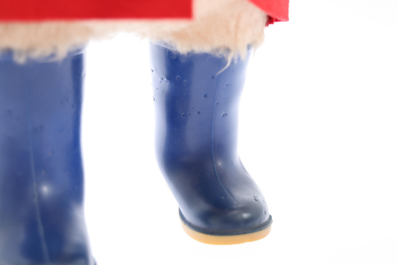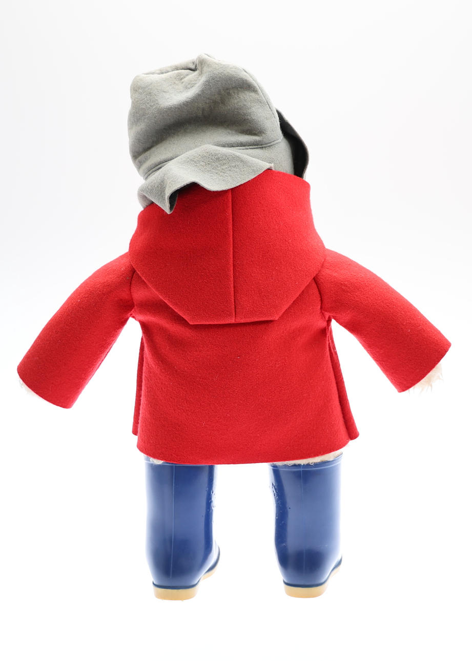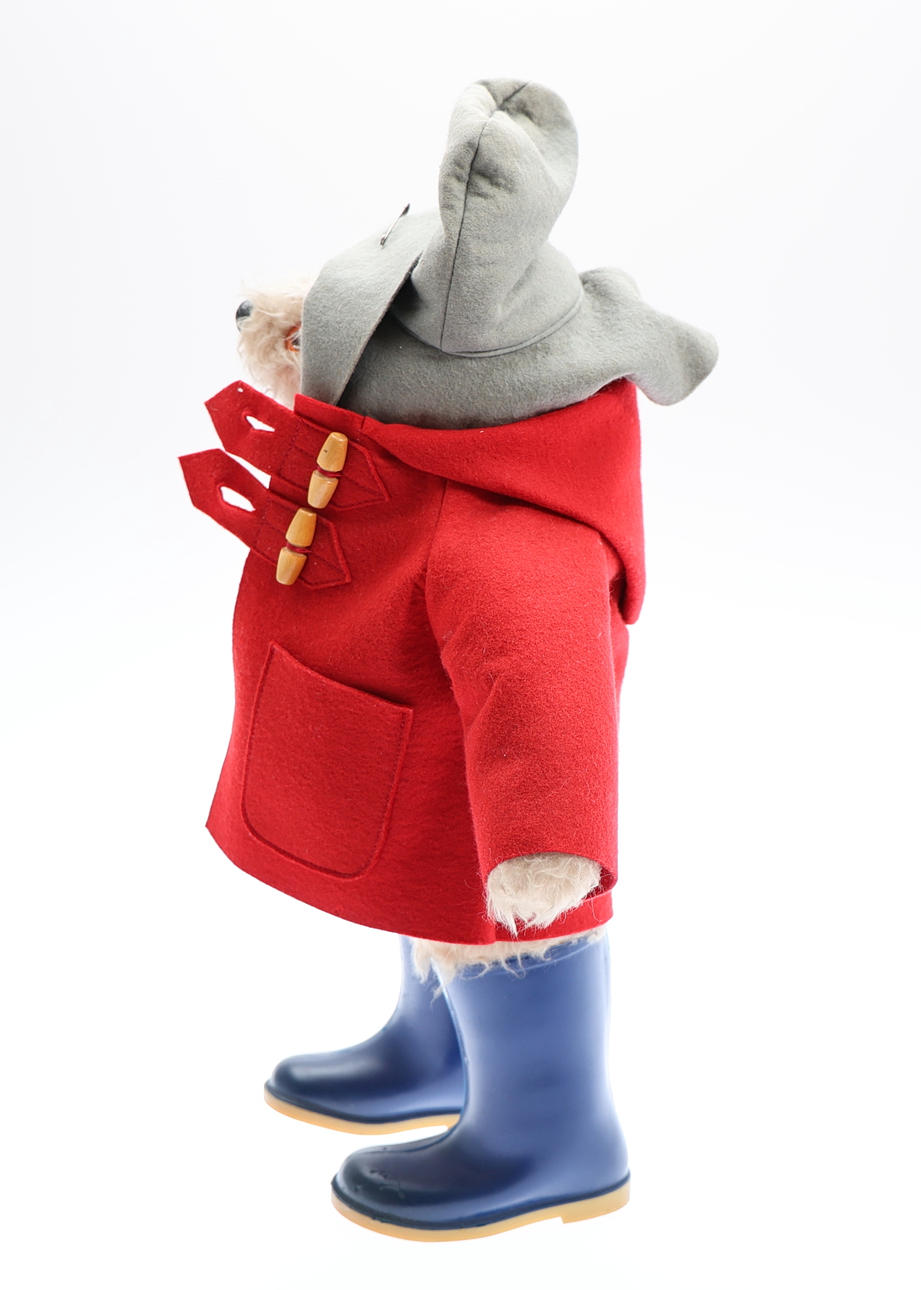 Wearing a grey felt hat, red duffle coat and blue Dunlop rubber wellington boots, (size 4), his rear seam bearing label, c.1974, H.50cm approx.