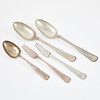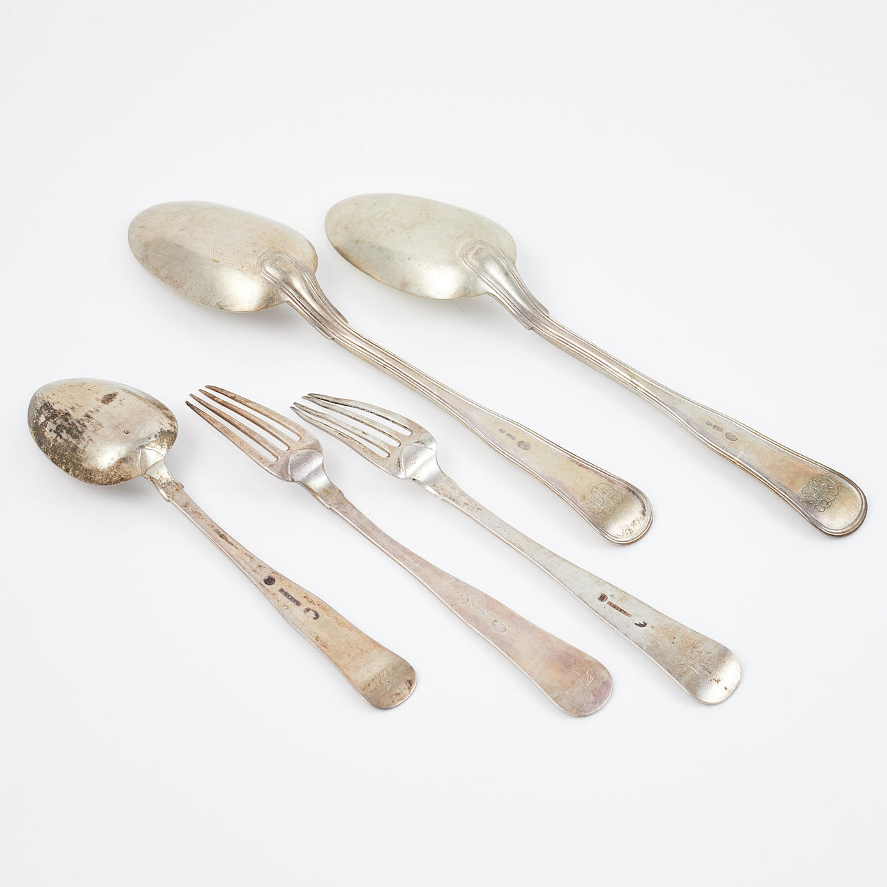 4469961. SPOONS & FORKS. Silver, 2+1+2 dlr., Old Danish model, 1850/60s, gift and monogram engraving, various blacksmiths and localities, Denmark.