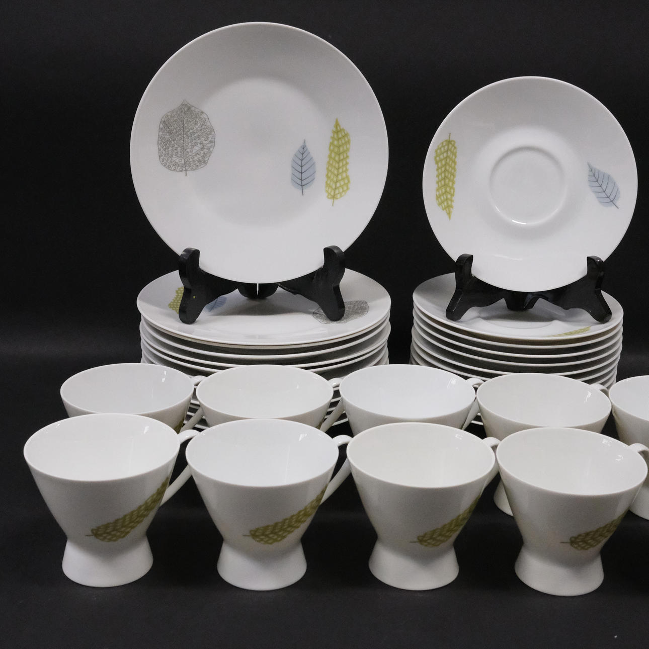 Motif with leaves, 10 cups, 12 saucers, 12 siettes, sugar bowl and cream jug.