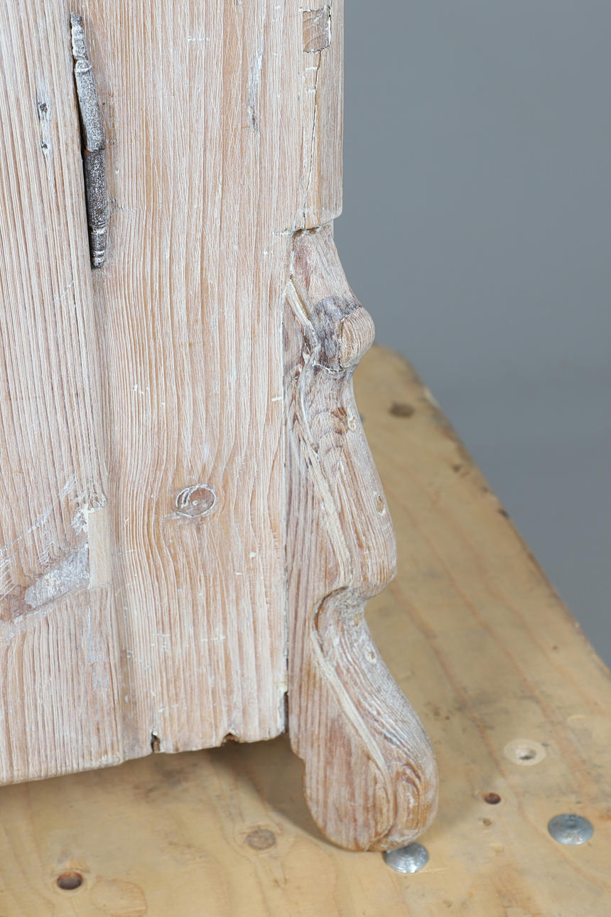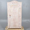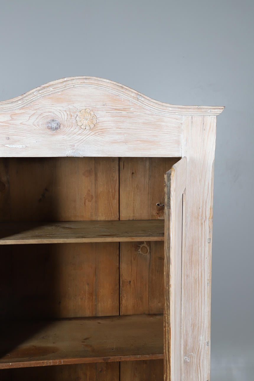 The single door opens to reveal 3 fixed interior shelves. Raised on feet (appears later back feet). Height 176.5cm, width 94cm, depth 45cm.