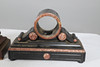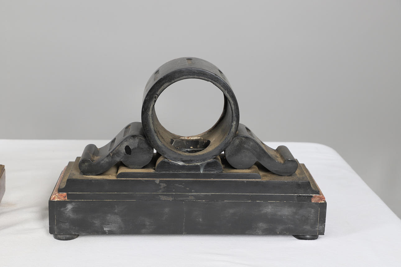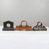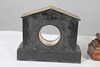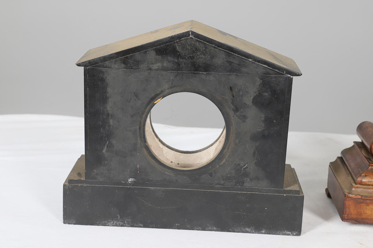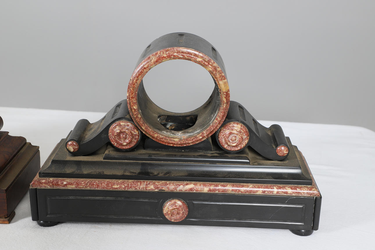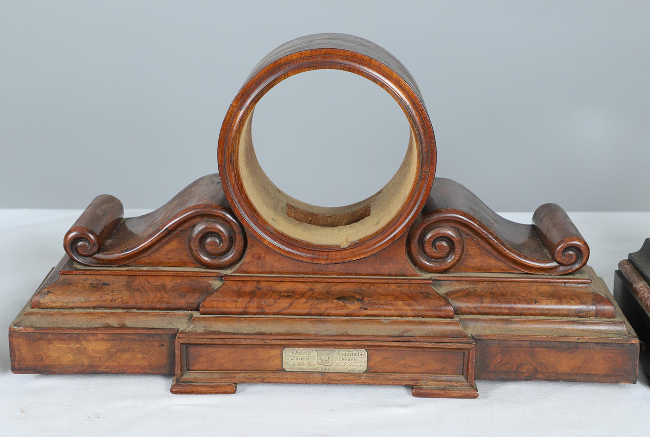 A burr walnut mantel clock case with scroll detail and presentation plaque, 21cm high x 51cm wide; a French black slate and red marble drumhead clock case, 24cm high x 39cm wide; and a further black slate case of architectural form, 28cm high x 33cm wide.
