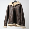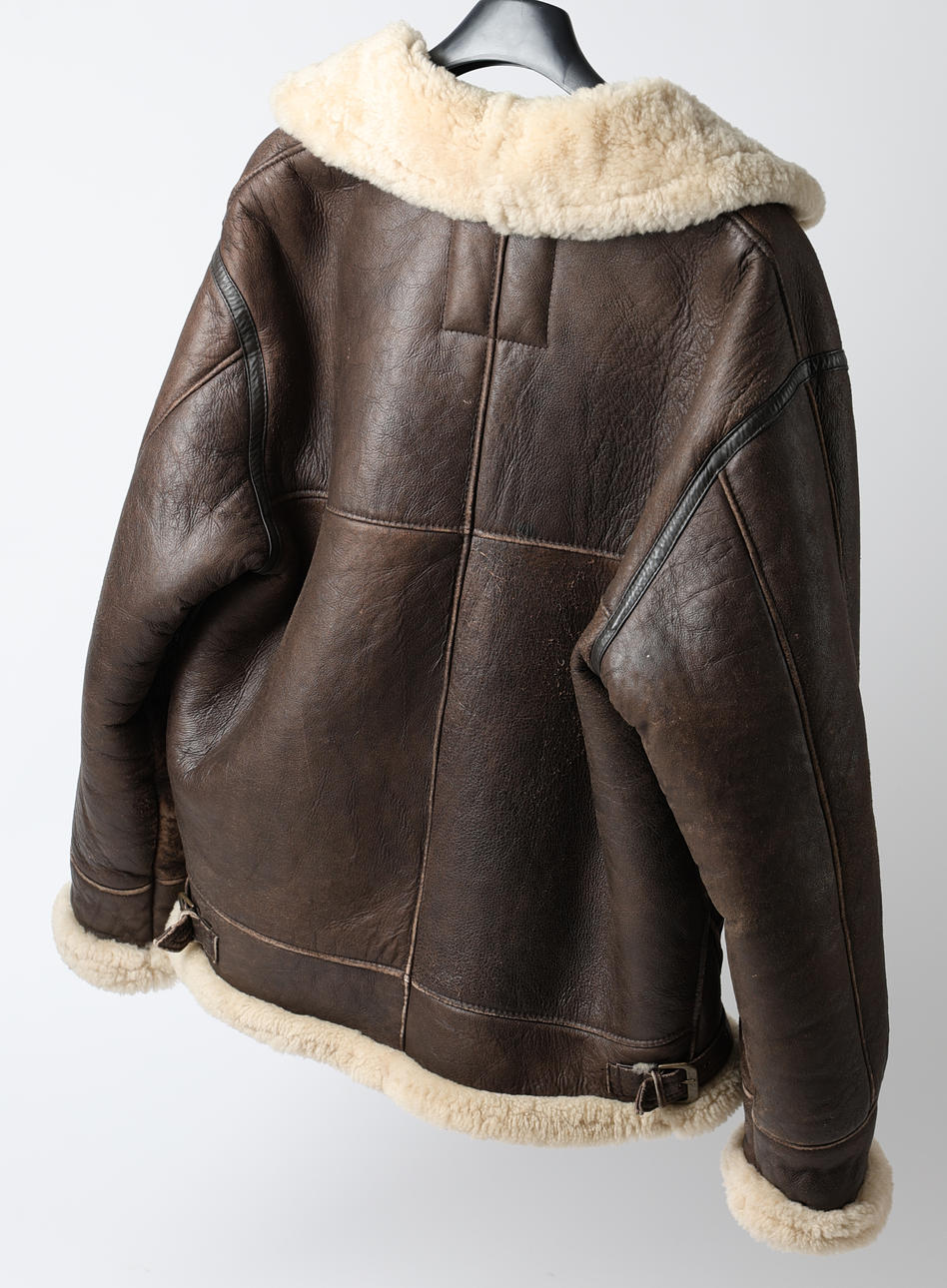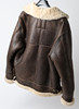 sheepskin jacket in brown leather with cream-colored sheepskin. Buttoned with front zipper, two hand pockets, collar with buckle. Chest width approx. 130 cm., length approx. 75 cm.