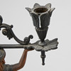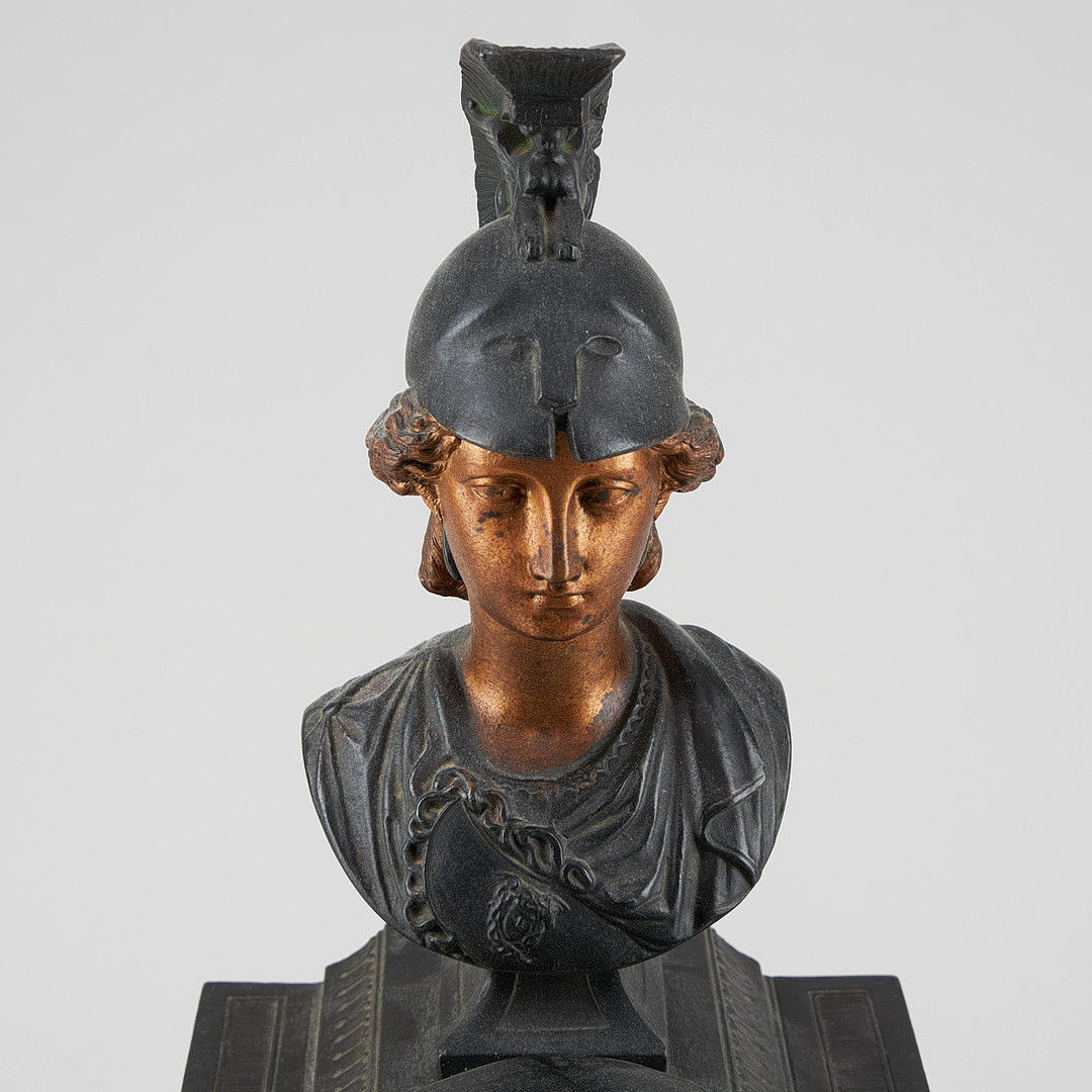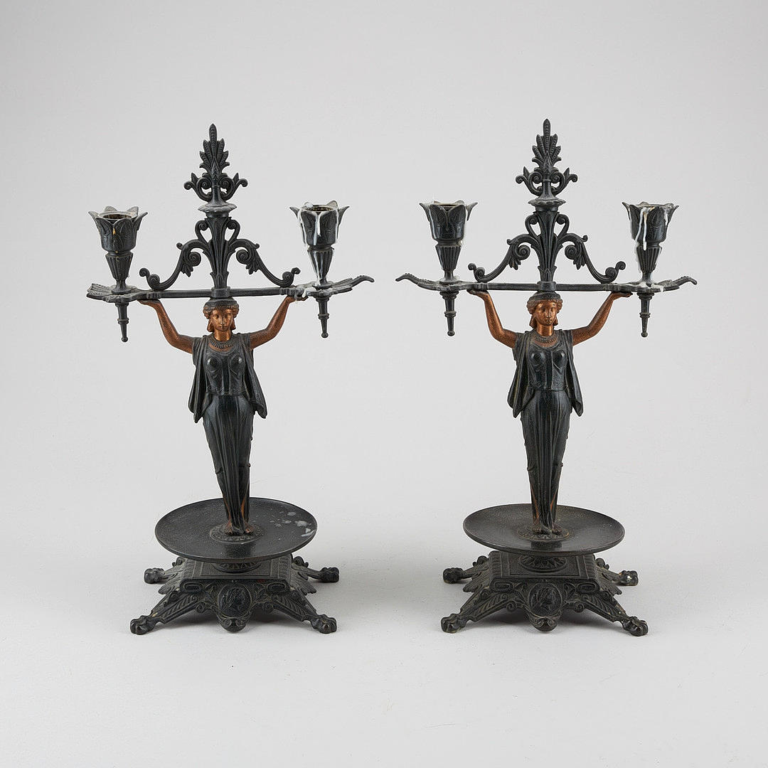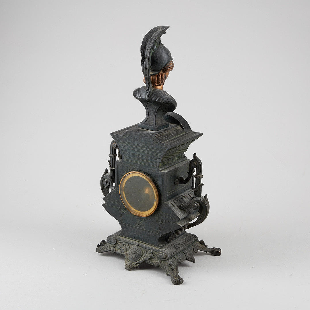 4473484. A late 19th century iron Middle European table clock and two candlesticks.