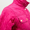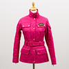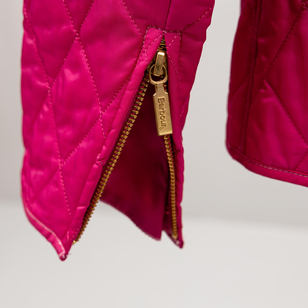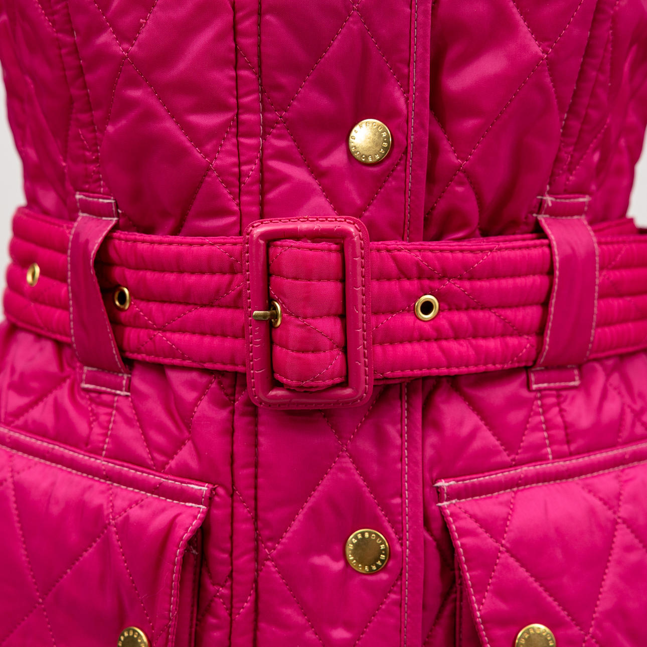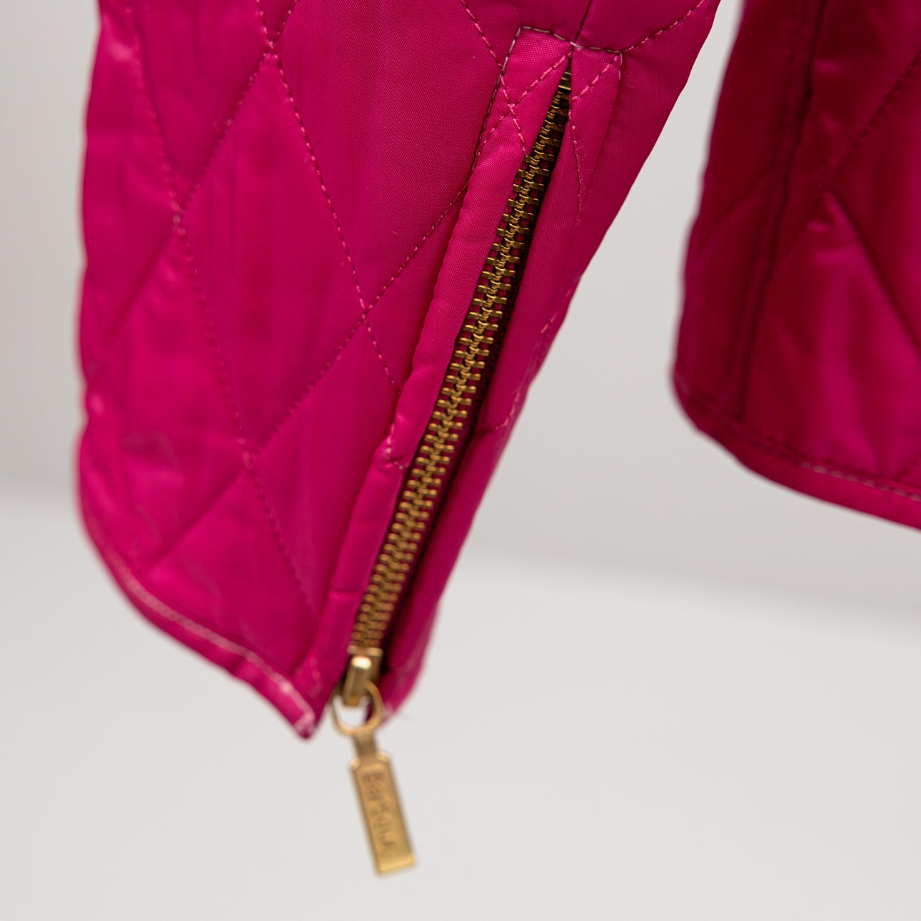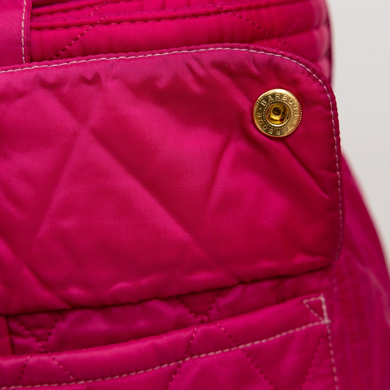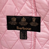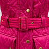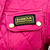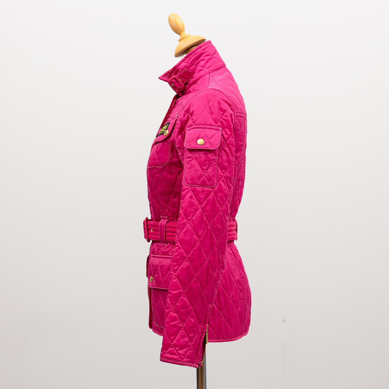 Cerise quilted classic Barbour jacket with belt and four pockets. Light pink lining. Marked “BARBOUR INTERNATIONAL” and with marking size EU32/UK 6/USA 2.