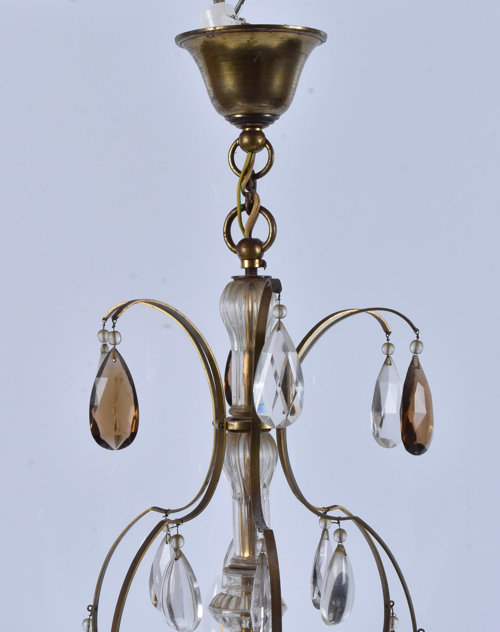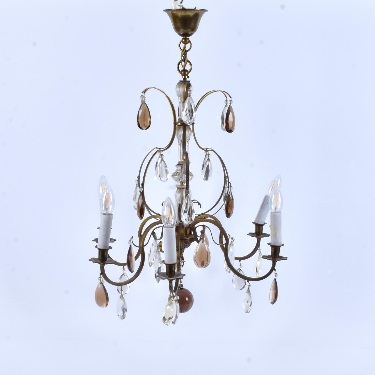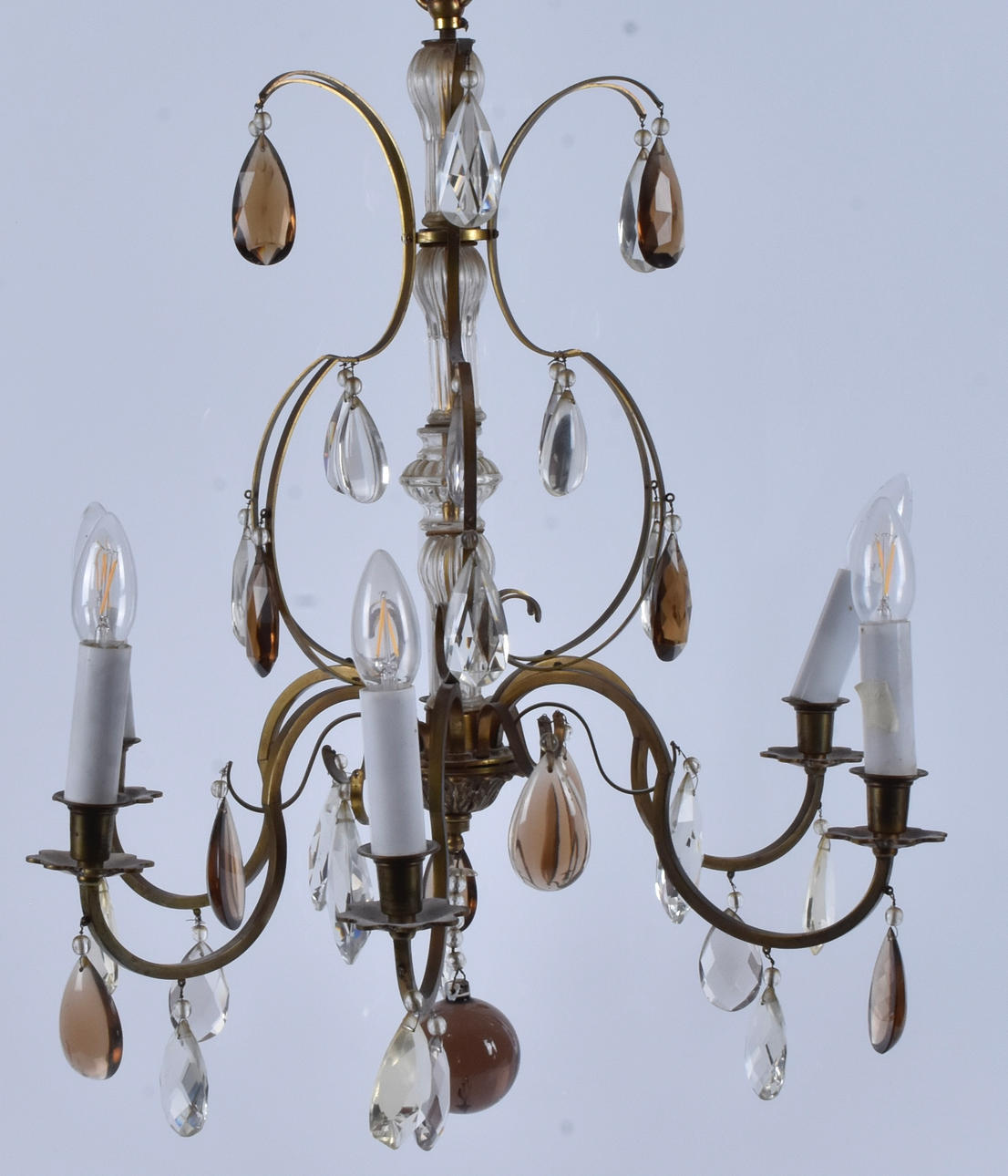 CEILING CHANDELIER, brass with partly coloured prisms.