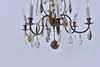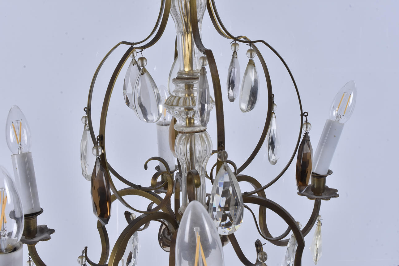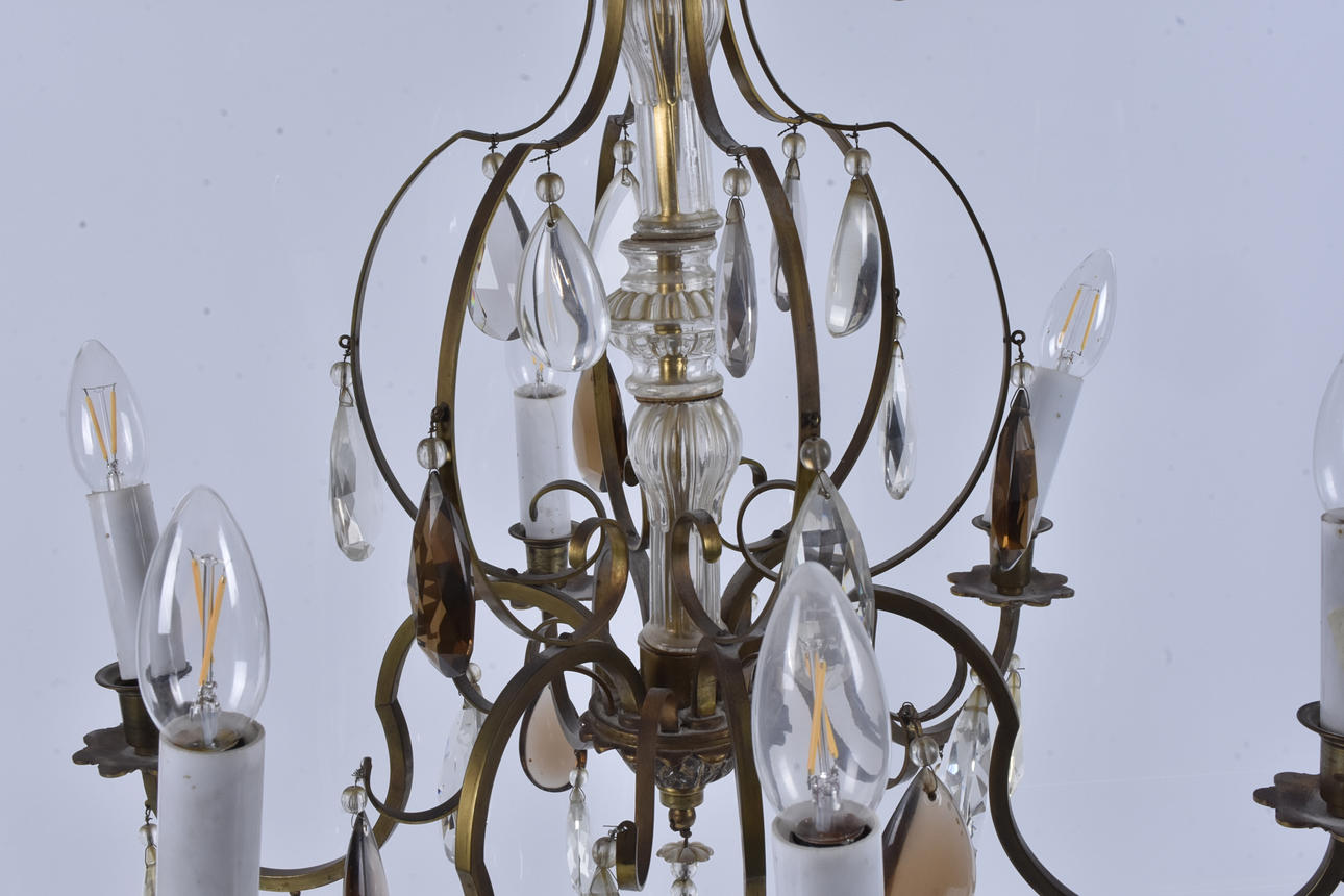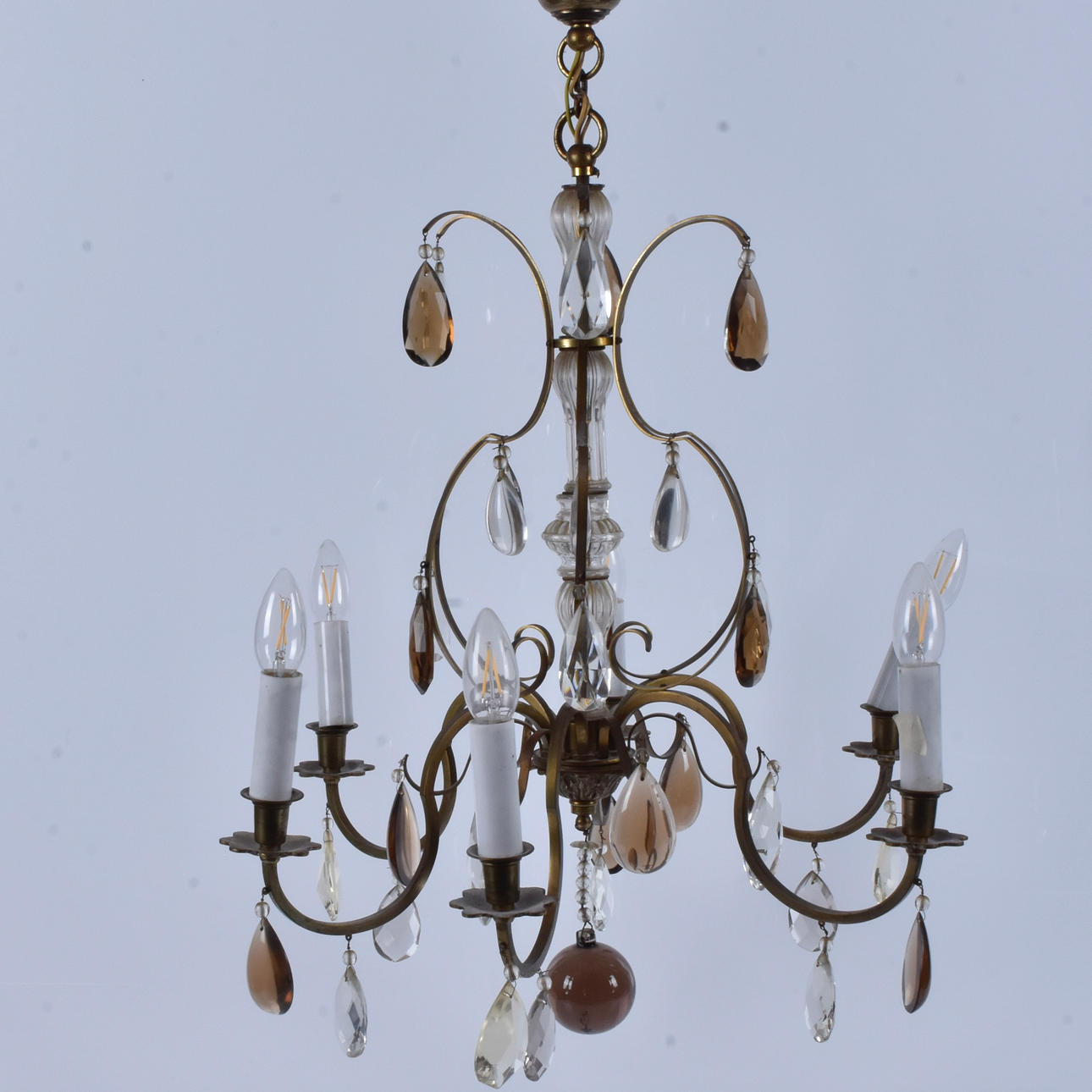 CEILING CHANDELIER, brass with partly coloured prisms.