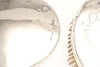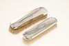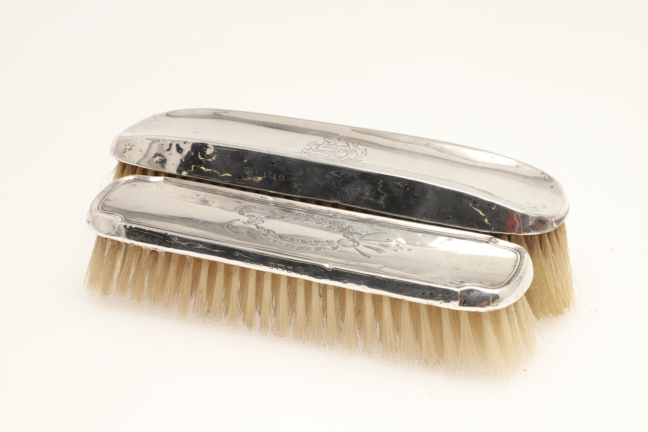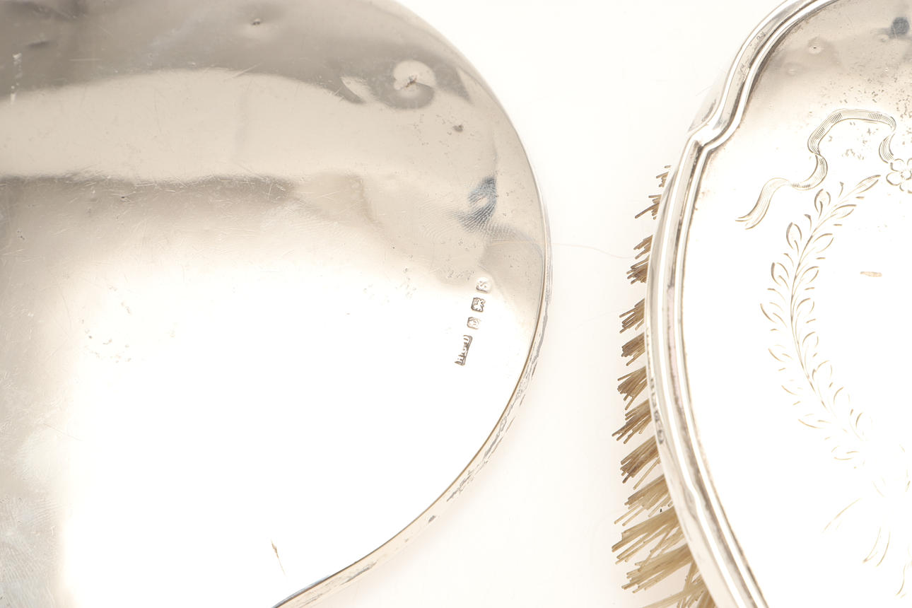 A matching set of two dressing table brushes and a mirror, all with engraved ribbon-tied scrolling decoration. Hallmarked for Birmingham 1952, W.G. Sothers Ltd. A similar mirror with plain back and a brush with stylised initials. 5 pieces.