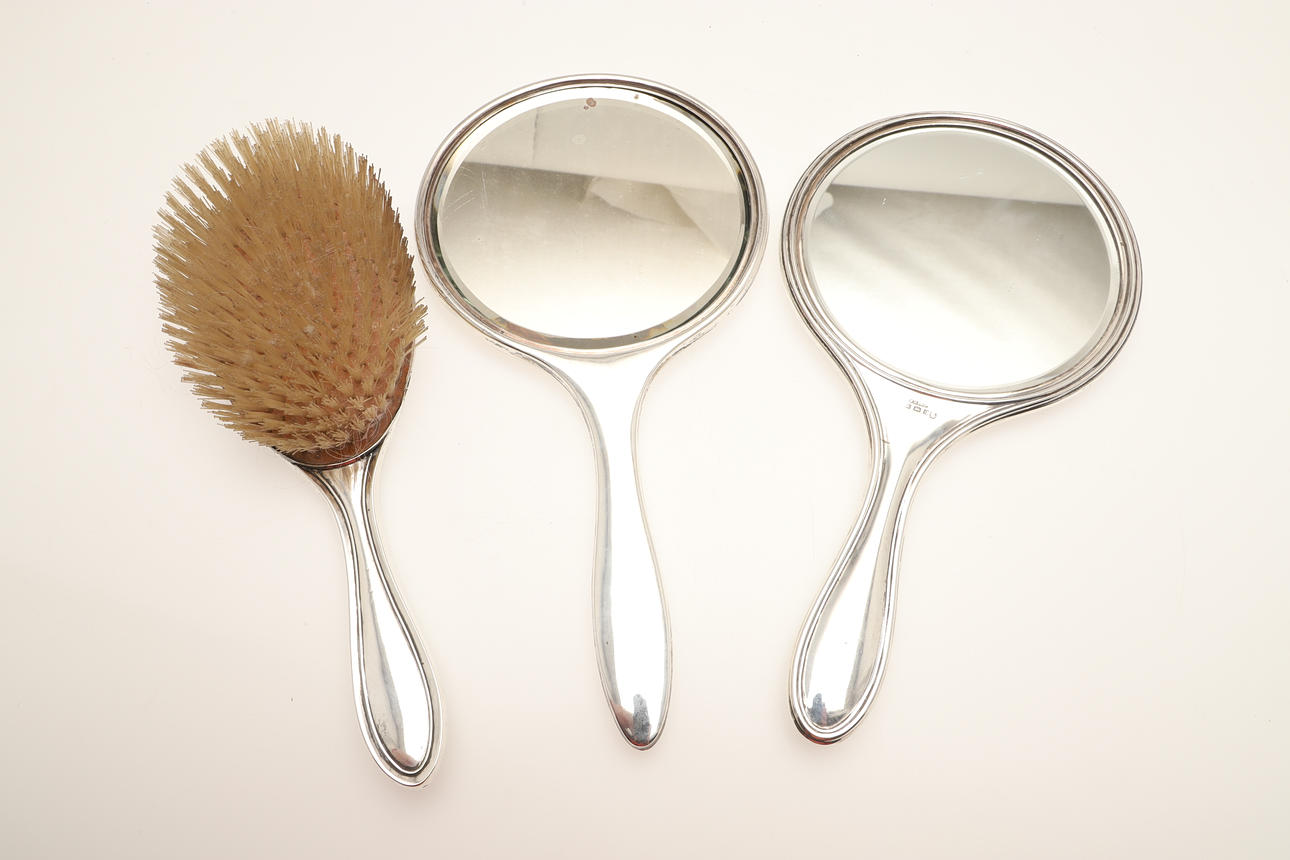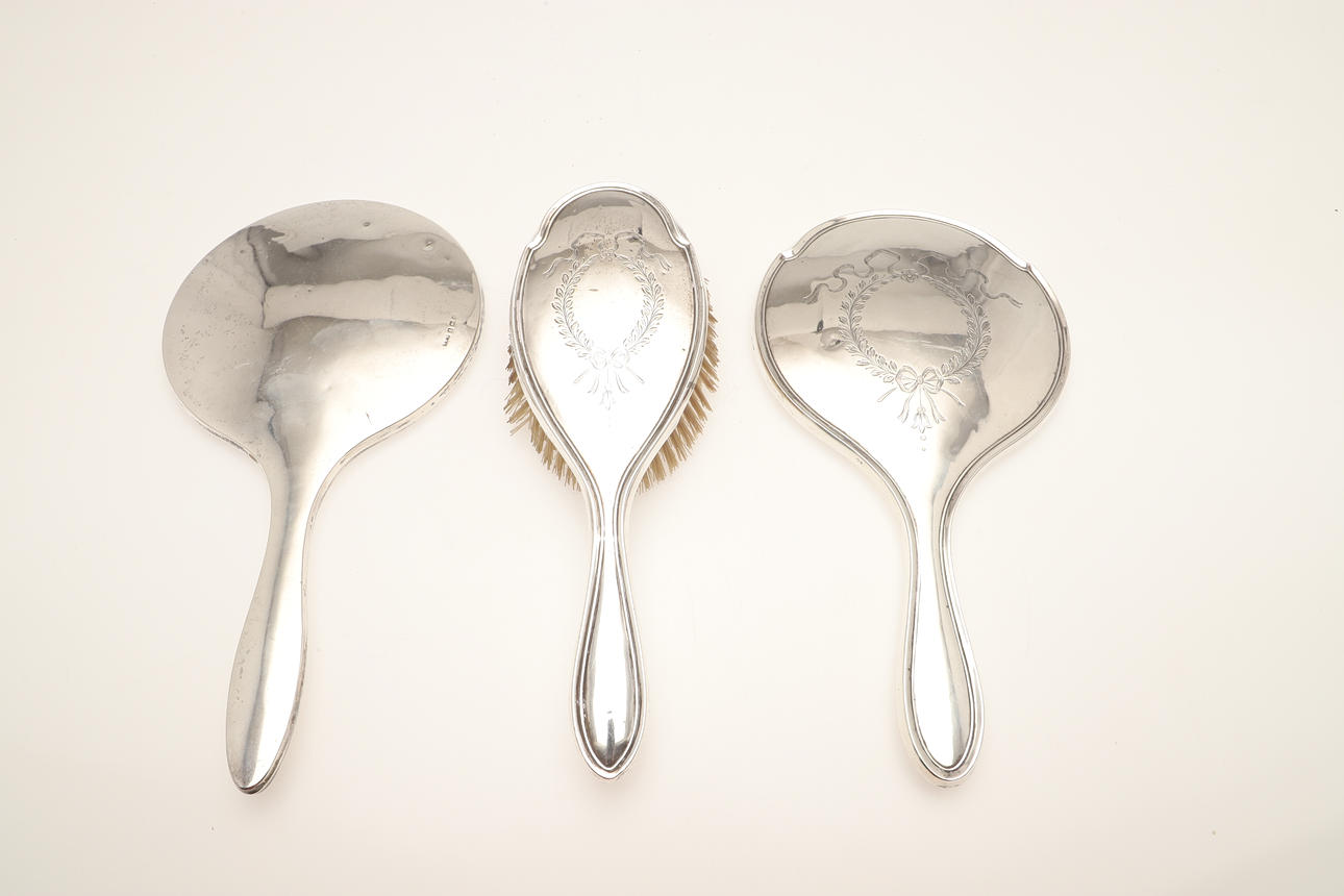 4475359. A COLLECTION OF SILVER DRESSING TABLE MIRRORS AND BRUSHES.