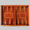 Veneered in different types of wood. Reversible disc with checkerboard and felted underside. Backammon plan in the space. Boxes with game pieces in the sarge. Length ca 75, width ca 57, height ca 72 cm.