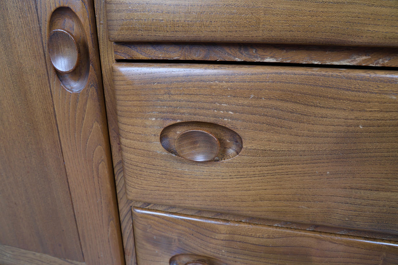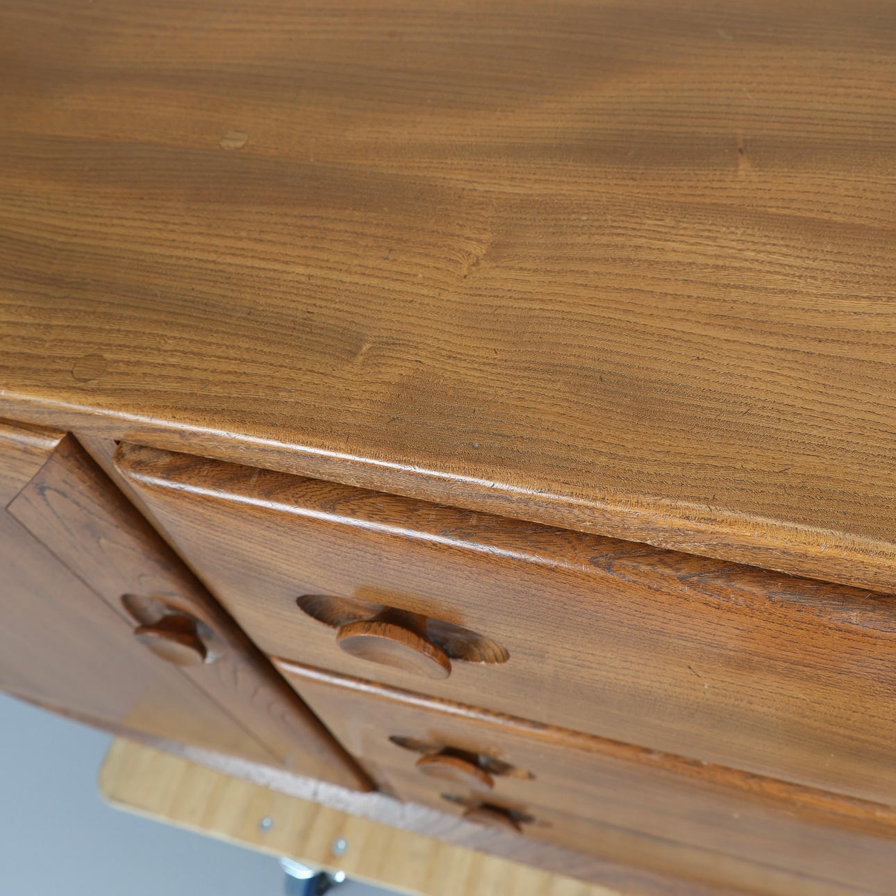 General wear overall, 2 chips below bottom drawer drawer, general scratches throughout. Overall, good condition.