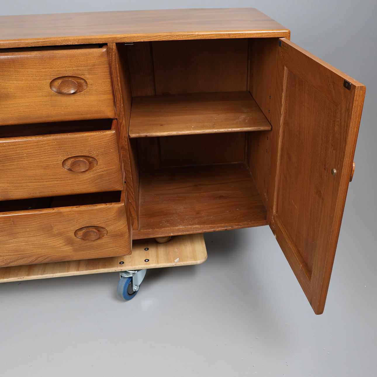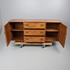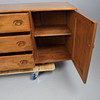 With three central drawers, top drawer has a green felt lined cutlery drawer with 5 sections, flanked by 2 cupboards, one on each side and both containing a single shelf. On shepherd castor wheels, Model no 455, 68 x 155.5 x 45cm overall.