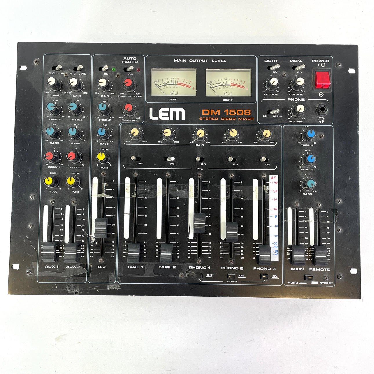4475800. MIXING TABLE, 2 pcs. LEM, “DM 1508" Stereo Disco Mixer.
