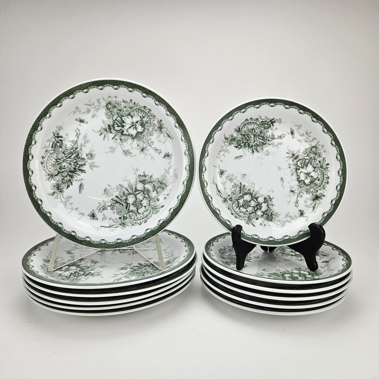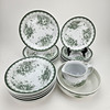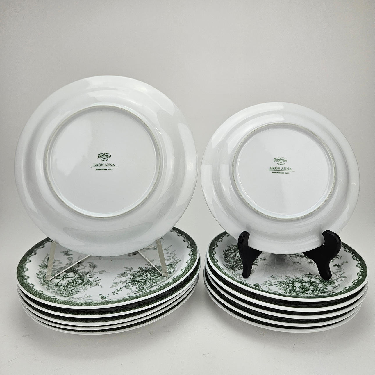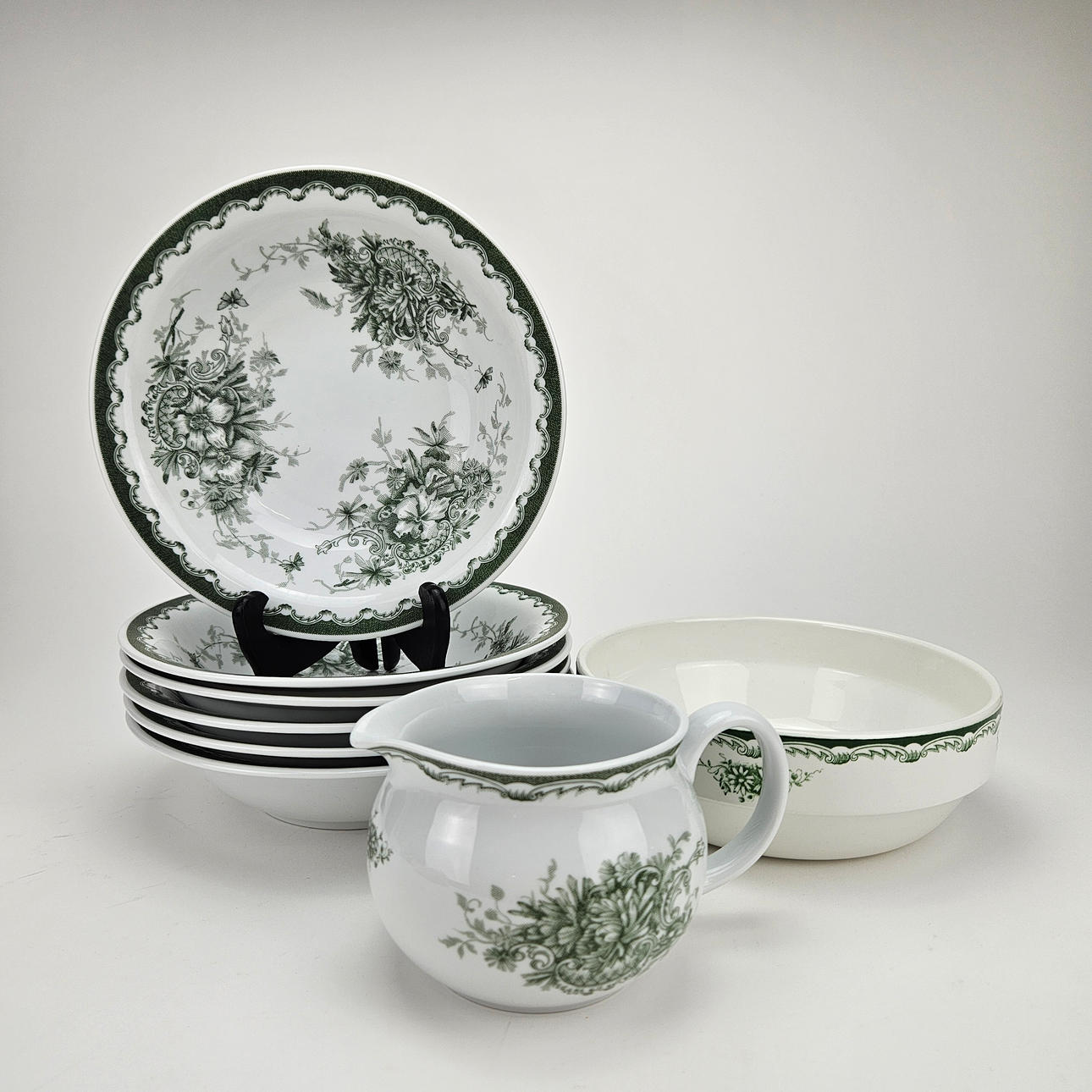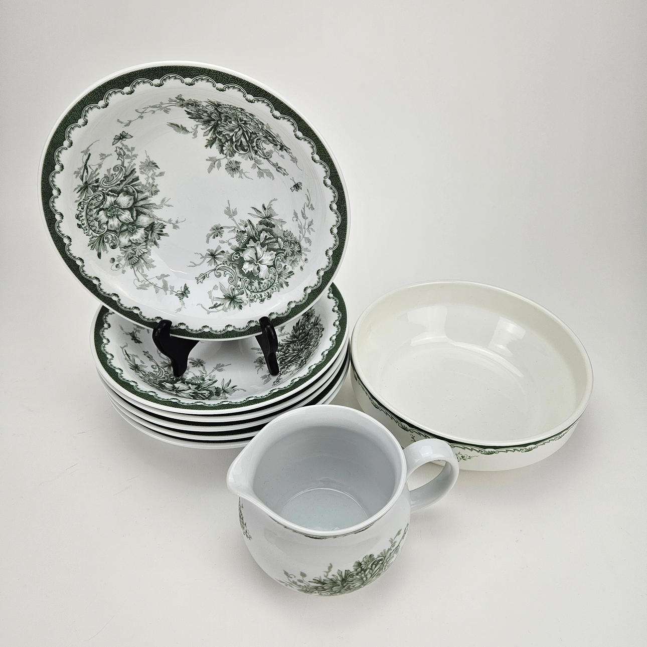 6 dinner plates, approx. 21 cm. 6 deep plates, approx. 20 cm. 6 servings/entrance plates, approx. 18 cm. Sauce jug, serving bowl.