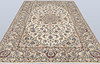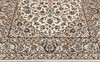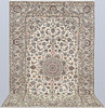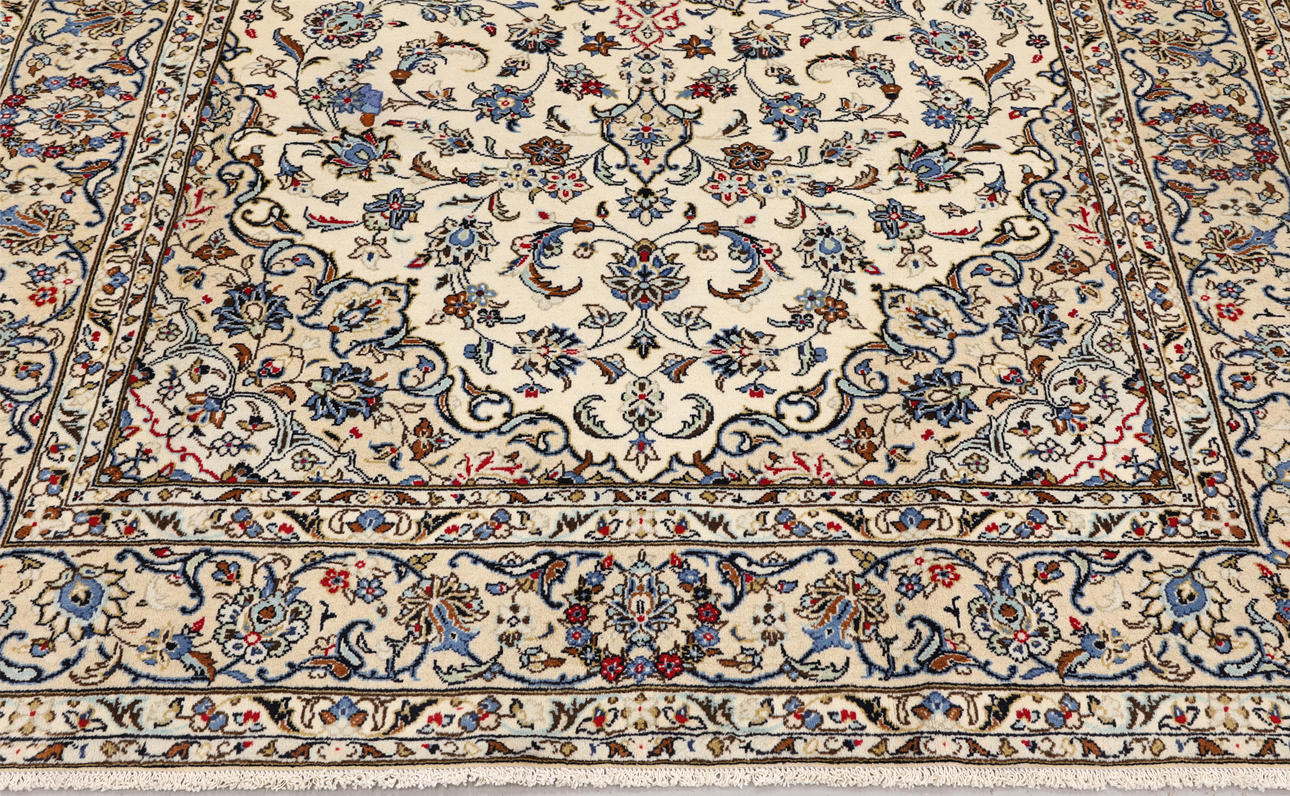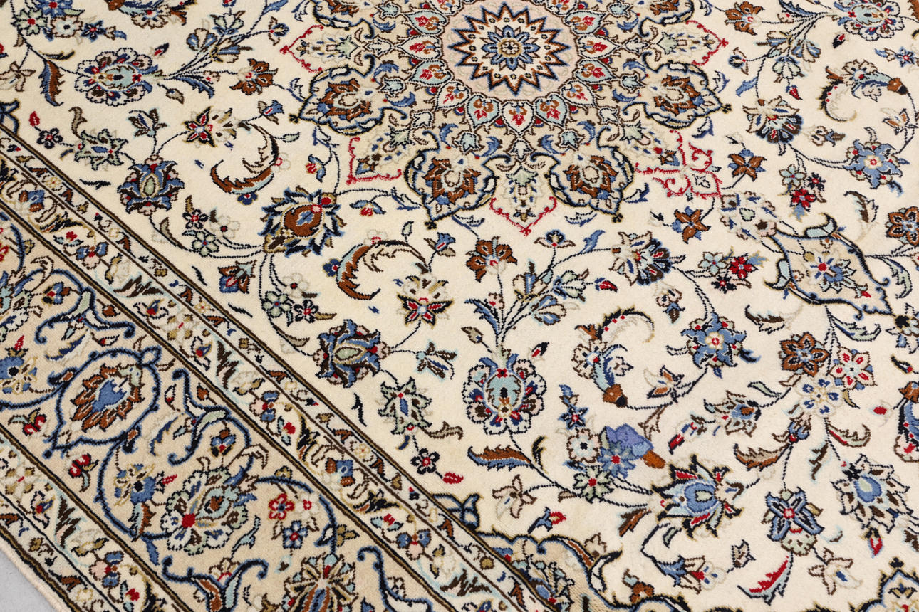 Keshan with bright bottom color and a centrally placed medallion with details in blue, brown and red. The center field is covered in floral ornamentation in similar shades, and the corner portions follow the same pattern structure. The border has a bright bottom and is decorated with additional floral motifs. The forelock is made of wool and the warp is of cotton.