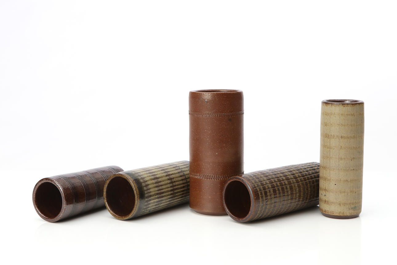 4476533. WALLÅKRA, CYLINDRICAL VASES, FIVE PCS. Salt-glazed stoneware. Arthur W Andersson, among others. Marked/signed underneath.