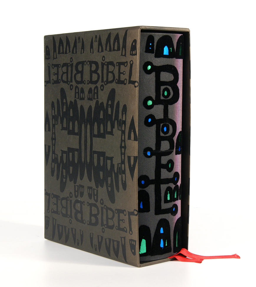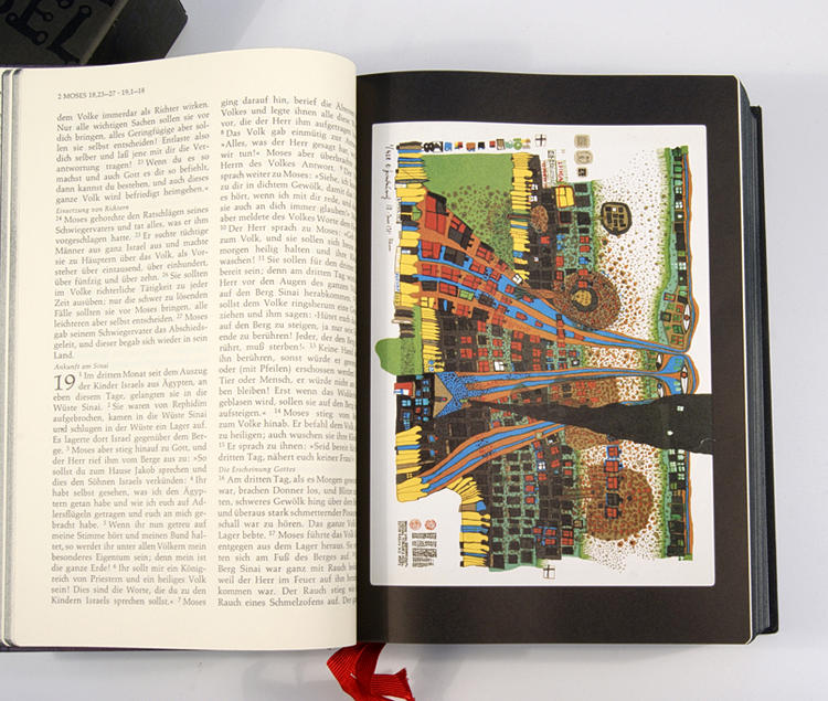 Magnificent edition illustrated by Friedensreich Hundertwasser. Translation by Vincenz Hamp and others. 1688 pages, bound, velvet binding in a slipcase. 1. Augsburg edition. 1995. Dimensions approx. Bible height 29 cm, width 21 cm.