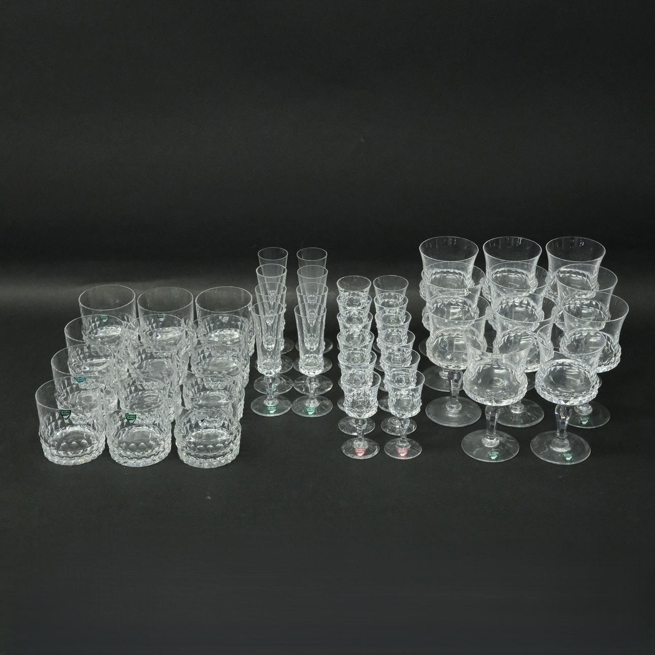 12 wine glasses, height 14cm, 12 selter glasses, height 8cm, 12 liqueur glasses, height 9,5cm and 8 snap glasses, height 13,5cm, II:a sort.