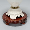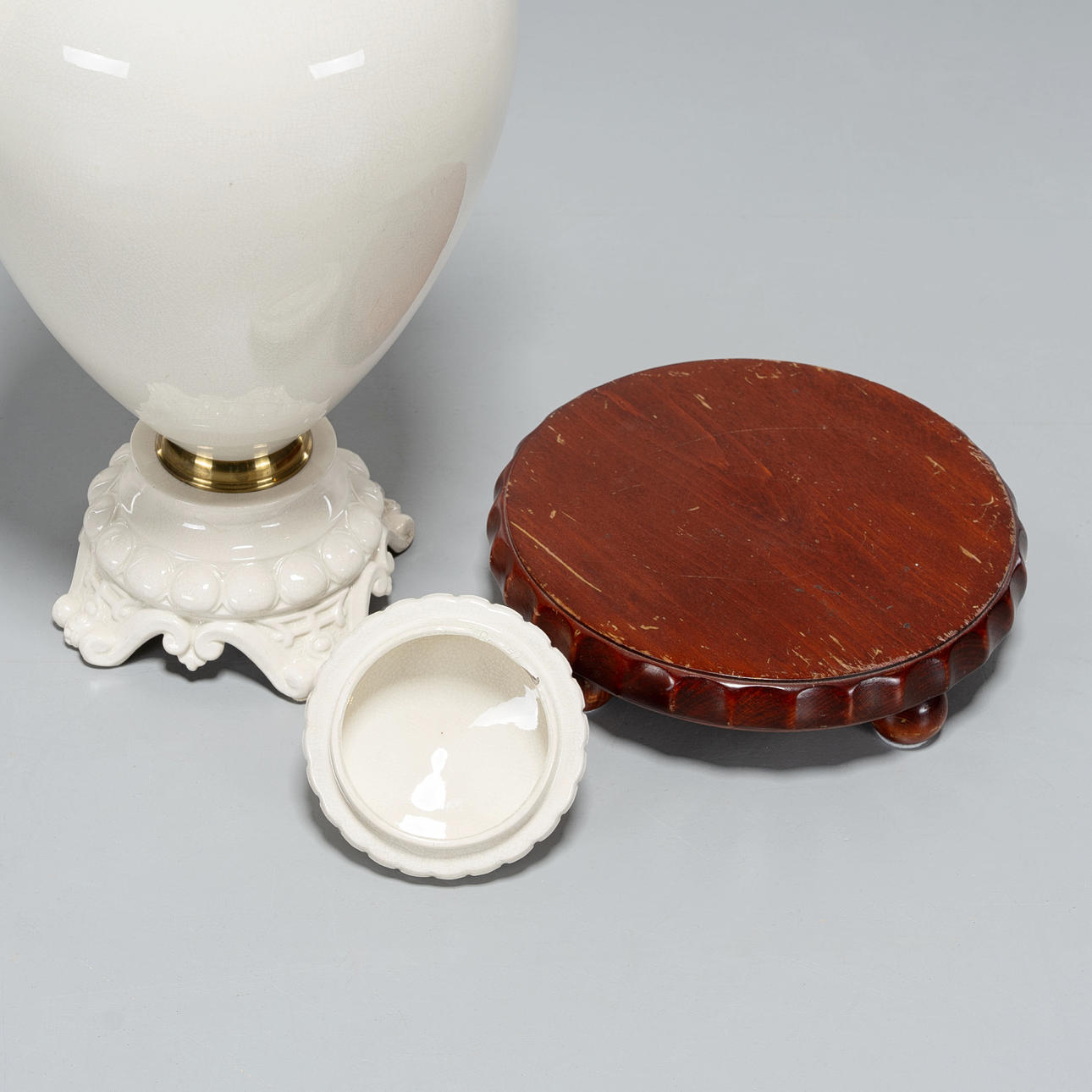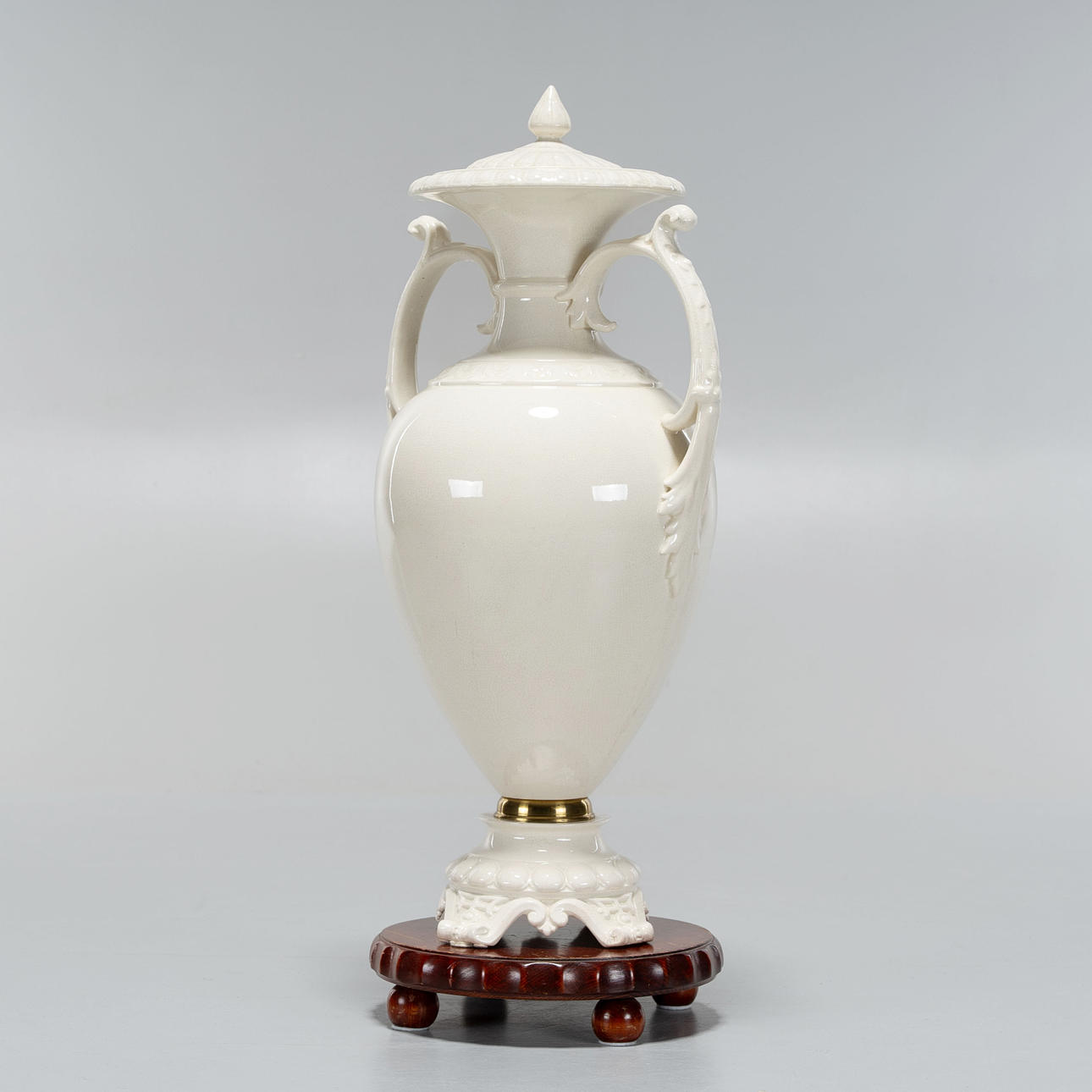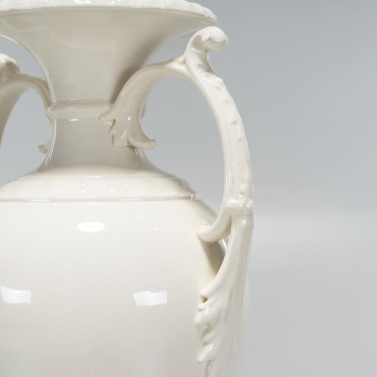 Vase/urn with curved foot, volute handles. Glazed stoneware with craquelé and decoration in relief, fitted with brass ring.