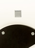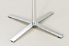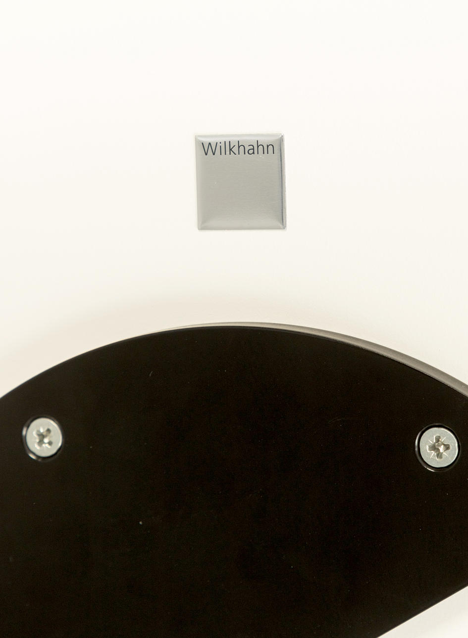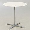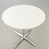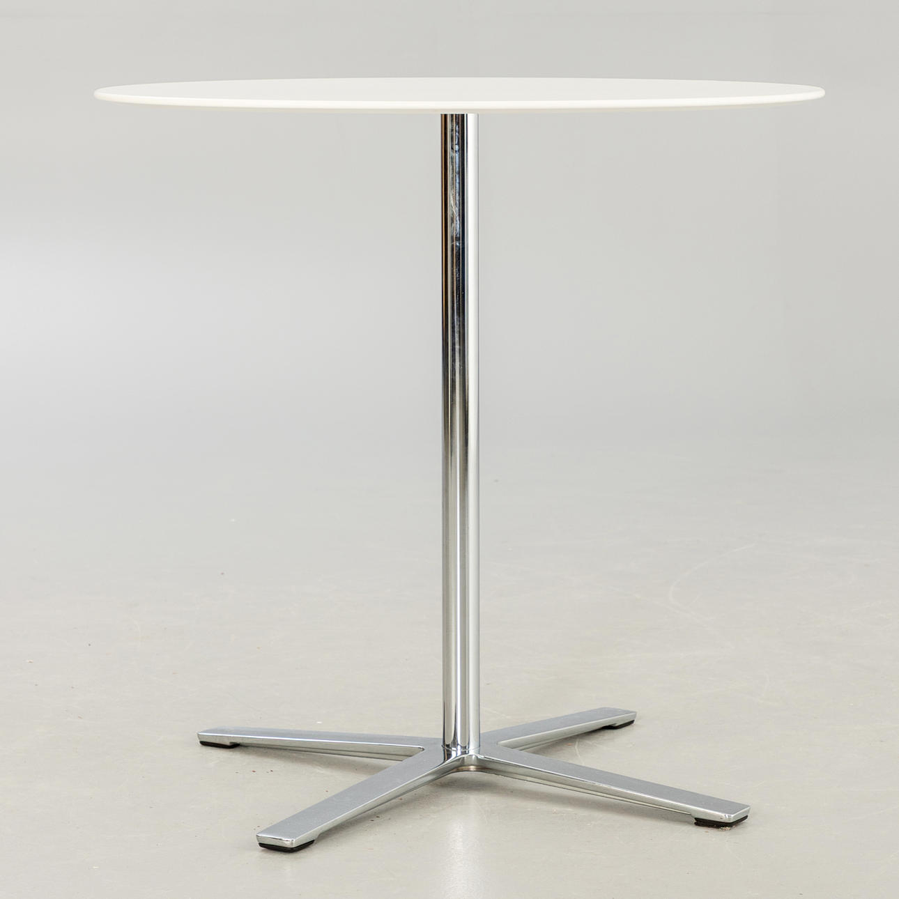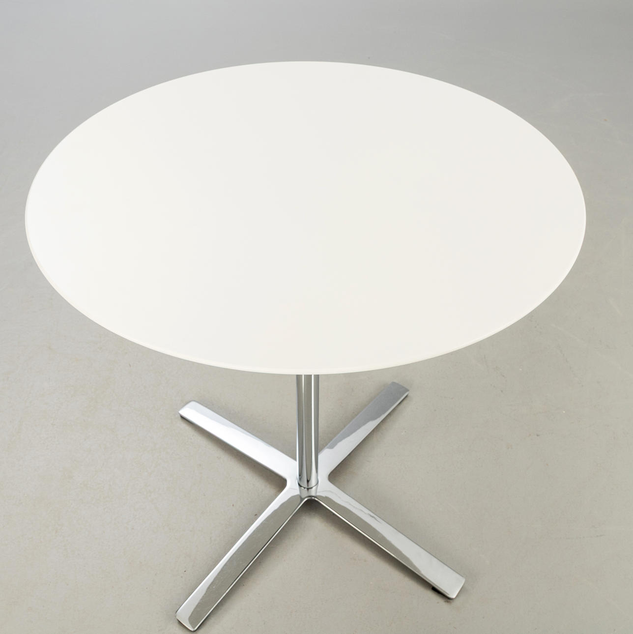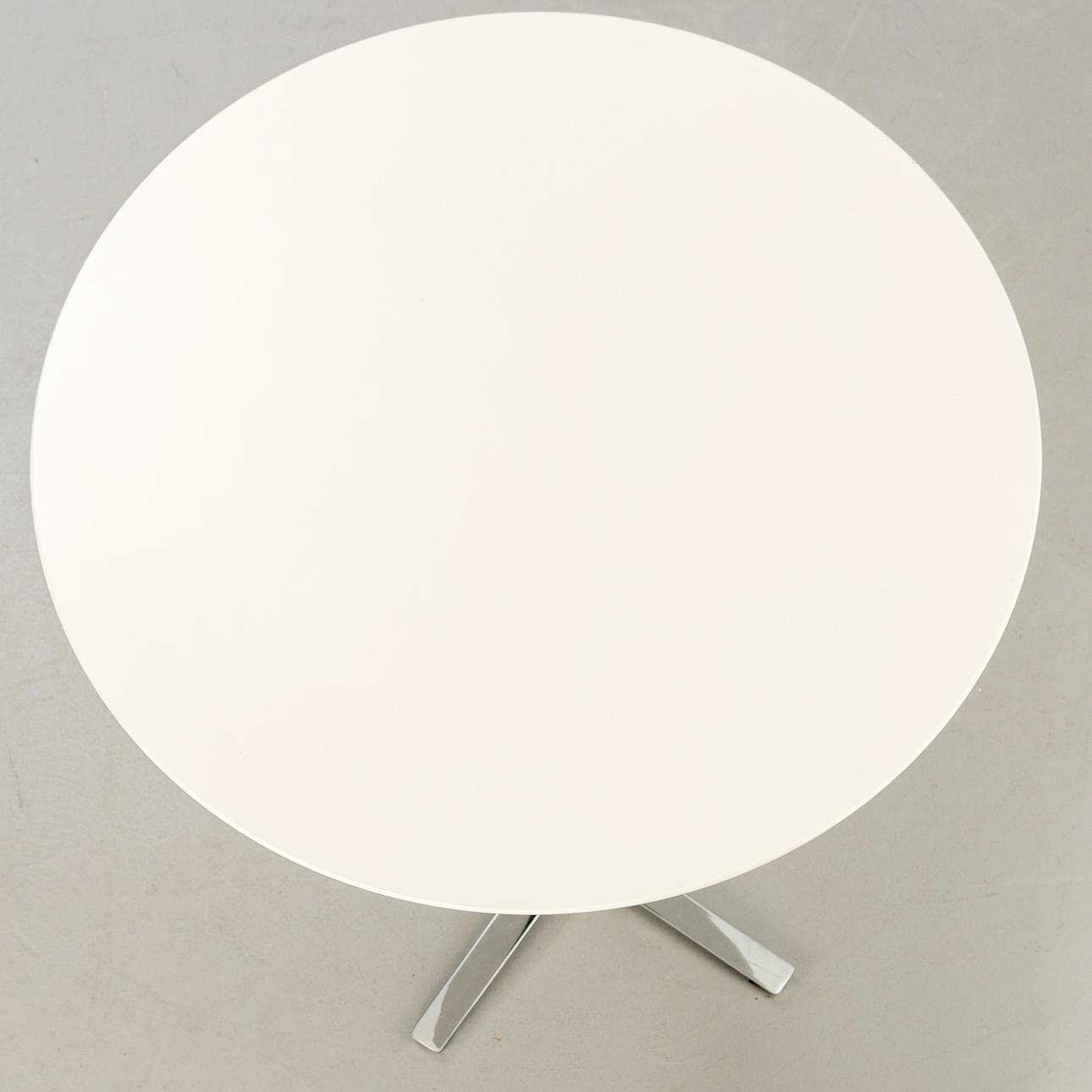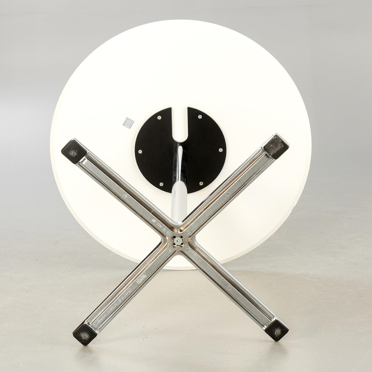 Round table top in white on a chrome-plated metal cross base. Inscribed below by the manufacturer.